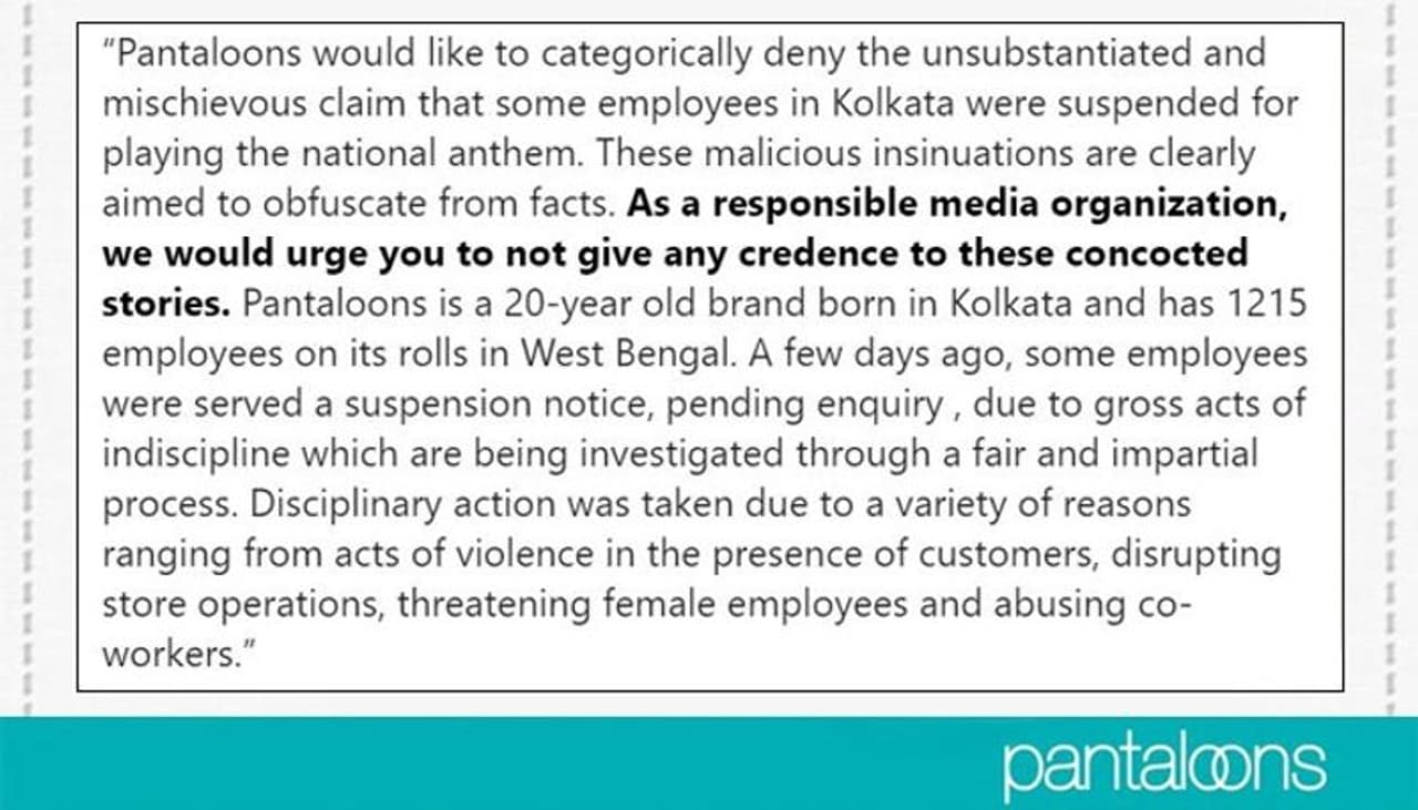 দিন কয়েক আগে কলকাতায় নিজেদের কয়েকজন কর্মীকে সাসপেন্ড করা হয়েছে। সেই খবর স্বীকার করে নিল প্যান্টালুনস ফ্যাশন অ্যান্ড রিটেল লিমি়টেড। তবে জাতীয় সঙ্গীত গাওয়ার জন্য এমন সিদ্ধান্ত নেওয়া হয়নি বলেই জানাচ্ছে কর্তৃপক্ষ।