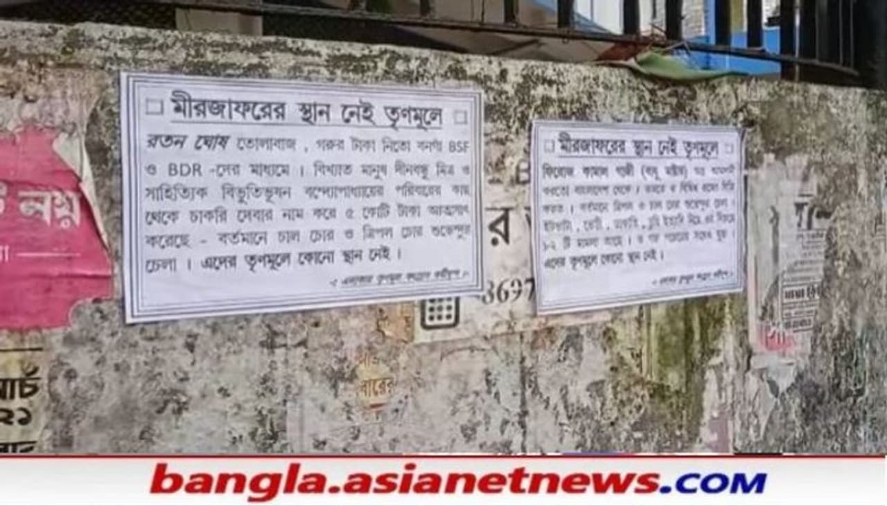 'মীরজাফরের স্থান নেই তৃণমূলে' বিধাননগর পৌরনিগমের দেয়ালে ওয়ার্ড কোর্ডিনেটর দেবাশীষ জানার বিরুদ্ধে দুর্নীতির অভিযোগের পোস্টারকে ঘিরে চাঞ্চল্য। তবে যে শুধু বিধাননগরই নয়, বারাসাত জেলা পরিষদ এলাকা জুড়ে বাবু মাস্টার ও রতন ঘোষকে 'মীরজাফর' উল্লেখ করেও 'তৃণমূলে কোন স্থান নেই' বলে পোস্টার পড়েছে।