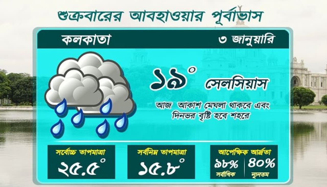 ভোররাত থেকেই কলকাতায় শুরু হয়েছে অঝোর ধারায় বৃষ্টি শুক্রবার কলকাতার সর্বনিম্ন তাপমাত্রা ১৫.৮ ডিগ্রী সেলসিয়াস তাপমাত্রা বাড়লেও শীতের আমেজ থাকবে আগামী কয়েকদিন রবিবার থেকেই আবারা পরিষ্কার হয়ে যাবে শহরতলির আকাশ
