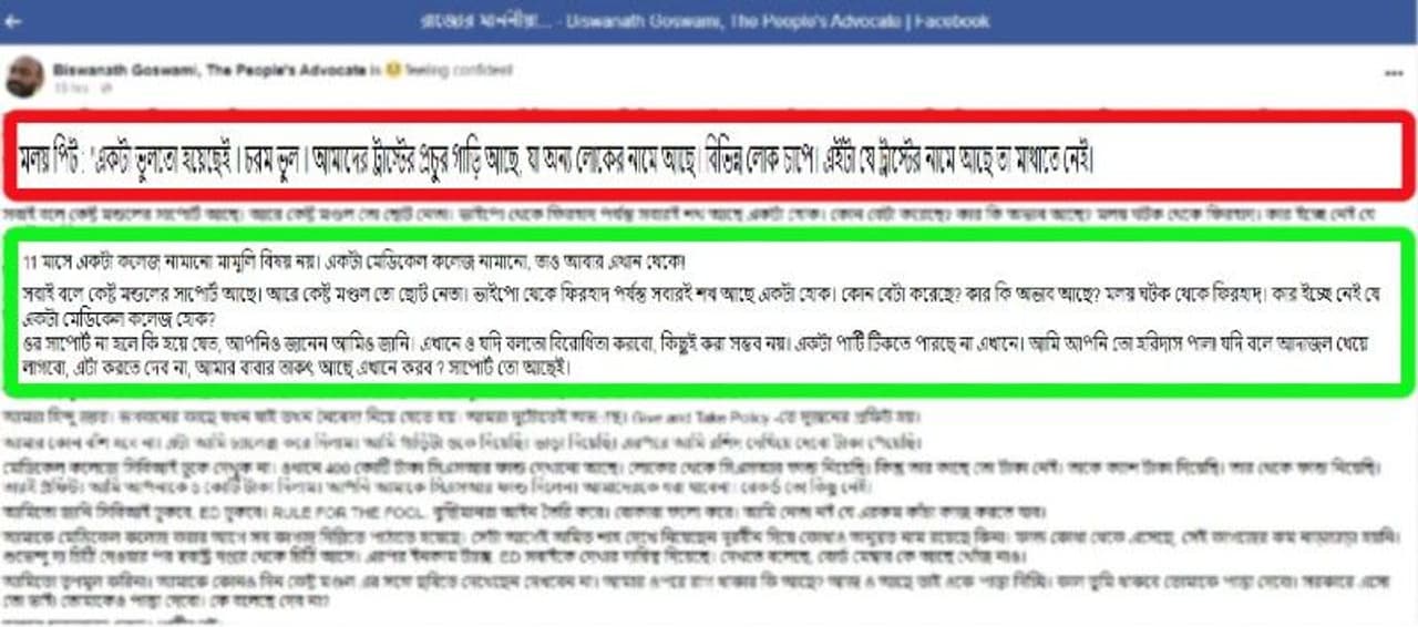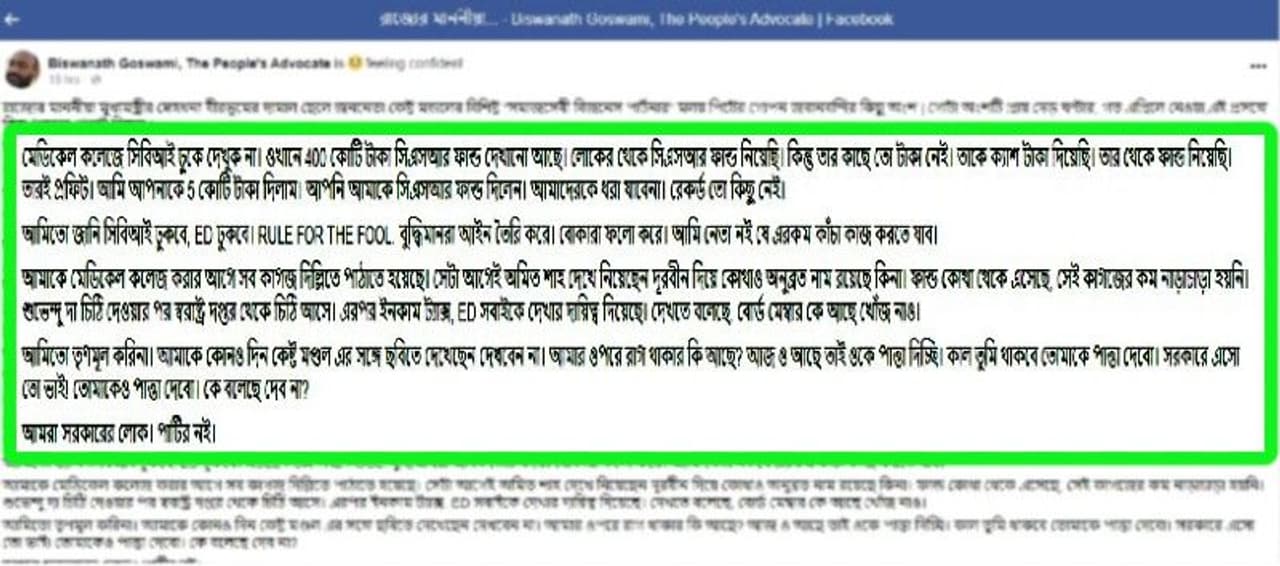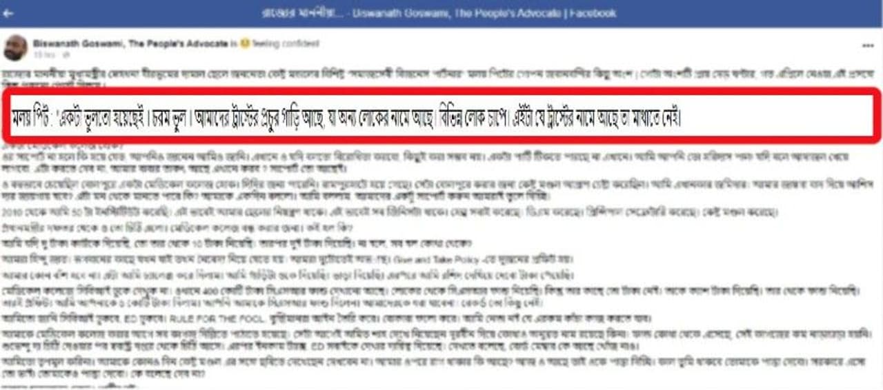বিশ্বনাথ গোস্বামী যে ফেসবুক পোস্ট করেছেন তাতে তিনি লিখেছেন, মলয় পিঠ নাকি অনুব্রত যে কালো মহিন্দ্রা এক্সইউভি গাড়ি-তে চাপতেন তা নিয়ে জানিয়েছেন, 'একটা ভুল তো হয়েইছে। চরম ভুল। আমাদের ট্রাস্টে প্রচুর গাড়ি আছে , যা অন্য লোকের নামে আছে। বিভিন্ন লোকে চাপে। এইটা যে ট্রাস্ট্রের নামে আছে তা মাথাতেই নেই।'