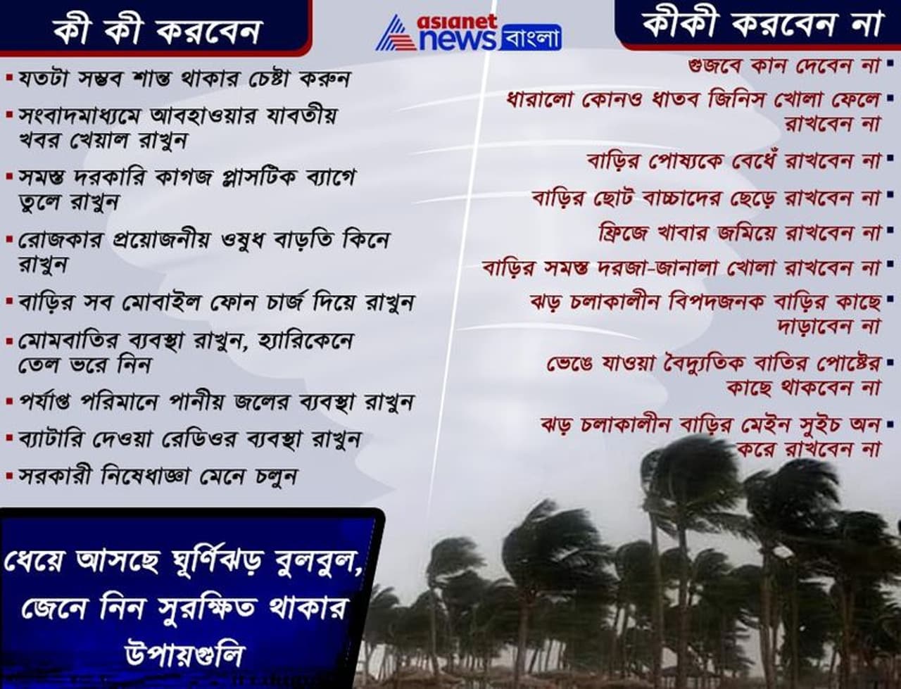 আলিপুর আবহাওয়া দফতর সূত্রে খবর, আগামী ১২ ঘন্টার মধ্য়েই পশ্চিমবঙ্গ এবং বাংলাদেশের আরও কাছে আসবে 'বুলবুল'। শনিবার সকালে রাজ্য়ে এই ঝড়়ের আছড়ে পড়ার সম্ভবনা রয়েছে। ঘূর্ণিঝড়ের জেরে শনিবার ও রবিবার দুই ২৪ পরগনা, পূর্ব মেদিনীপুর কলকাতা, হাওড়া, হুগলি এবং নদিয়াতে ভারী বৃষ্টি হওয়ার সম্ভাবনা রয়েছে। তবে কলকাতাতে অপেক্ষাকৃত কম বৃষ্টি হওয়ার সম্ভাবনা। শুক্রবার থেকেই সমুদ্রোপকূলবর্তী এলাকায় হাওয়ার গতিবেগ আরও বাড়বে এবং বৃষ্টিও শুরু হবে। এর প্রভাব পড়বে উত্তর ওড়িশার উপকূলেও। তাই, ক্ষয়ক্ষতির আশঙ্কাও উড়িয়ে দিচ্ছে না আবহাওয়া দফতর। এ রাজ্যের দিঘা, মন্দারমণি, শঙ্করপুর এবং বকখালিতে সমুদ্র উত্তাল হয়ে উঠবে। তাই এই মুহূর্তে, ঝড় শুরুর আগে এবং ঝড় চলাকালীন সময়ের জন্য় কতগুলি গুরুত্বপূর্ণ বিষয় জেনে নিন।