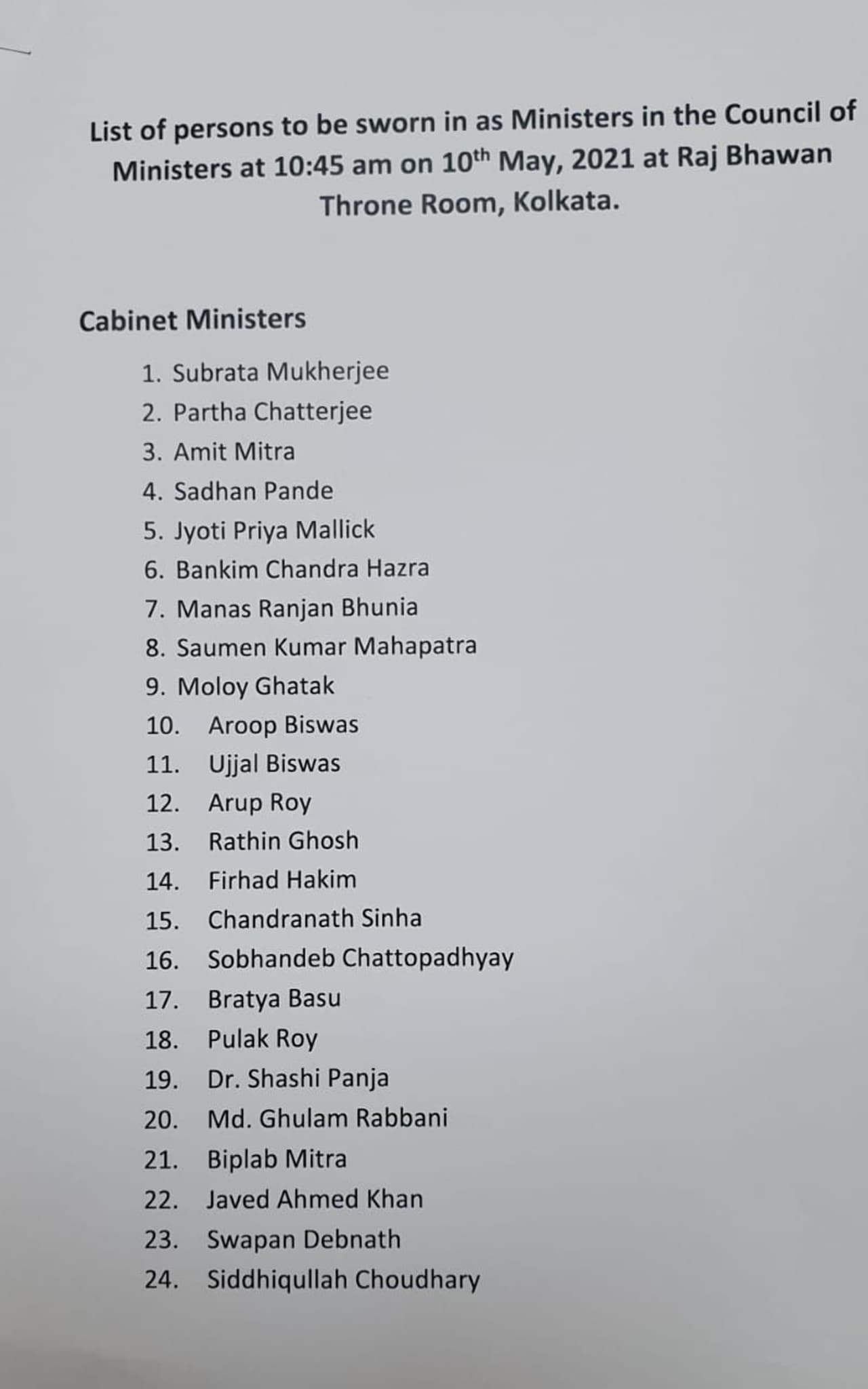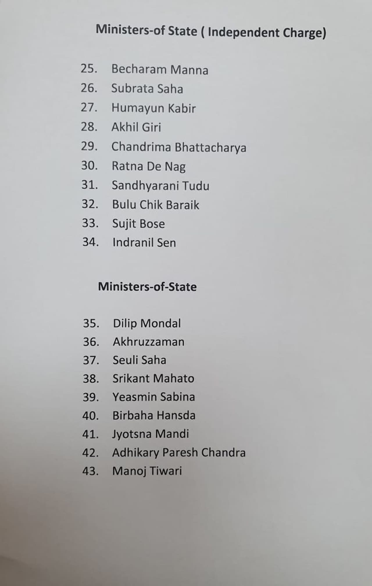 তালিকায় রয়েছেন কিছু নতুন মুখ। থাকছেন মানস ভুইয়া, রত্না দে নাগ, অখিল গিরি, শিউলি সাহা, বীরবাহা হাঁসদা, মনোজ তিওয়ারির মতো বেশ কয়েকজন। মোট পূর্ণমন্ত্রী হবেন ২৪ জন। প্রতিমন্ত্রী থাকবেন ১৯ জন। স্বাধীন দায়িত্ব প্রাপ্ত মন্ত্রী হবেন ১০ জন। সোমবার তাই শপথ নিতে চলেছেন মোট ৪৩ জন মন্ত্রী।