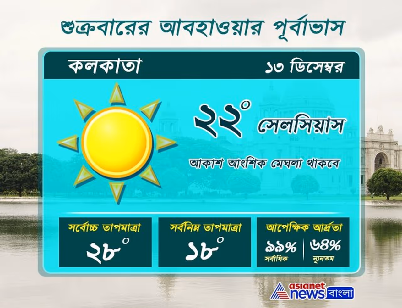 আবহাওয়া দফতরের খবর অনুযায়ী, শুক্রবার শহরের সর্বোচ্চ তাপমাত্রা থাকতে পারে ২৮ ডিগ্রি সেলসিয়াসের কাছাকাছি। শহরের সর্বনিম্ন তাপমাত্রার পারদ ছুঁতে পারে ১৮ ডিগ্রি সেলসিয়াস। শহরের বাতাসে আপেক্ষিক আর্দ্রতার পরিমাণ সর্বাধিক ৯৯ শতাংশ। আপেক্ষিক আর্দ্রতার পরিমাণ ন্যূনতম ৬৪ শতাংশ। বেলা বাড়ার সঙ্গে তাপমাত্রা খানিকটা বেড়ে ২২ ডিগ্রি সেলসিয়াস।