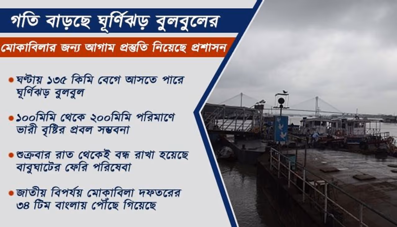 ঘণ্টায় ১৩৫ কিমি বেগে আসতে পারে ঘূর্ণিঝড় বুলবুল ১০০মিমি থেকে ২০০মিমি পরিমাণে ভারী বৃষ্টির প্রবল সম্ভবনা শুক্রবার রাত থেকেই বন্ধ রাখা হয়েছে বাবুঘাটের ফেরি পরিষেবা বাংলা ও ওডিশায় পৌঁছে গিয়েছে এনডিআরএফ-র ৩৪ টিম