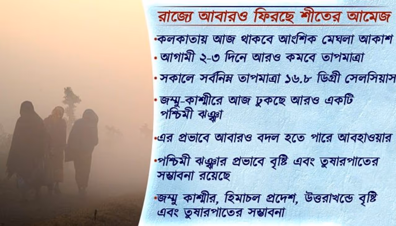 রাজ্যে আবারও নামবে পারদ ২ থেকে ৩ ডিগ্রি অবধি নামতে পারে তাপমাত্রা আগামী ২থেকে ৩ দিন অবধি থাকবে এই তাপমাত্রা কলকাতায় আজ থাকবে আংশিক মেঘলা আকাশ