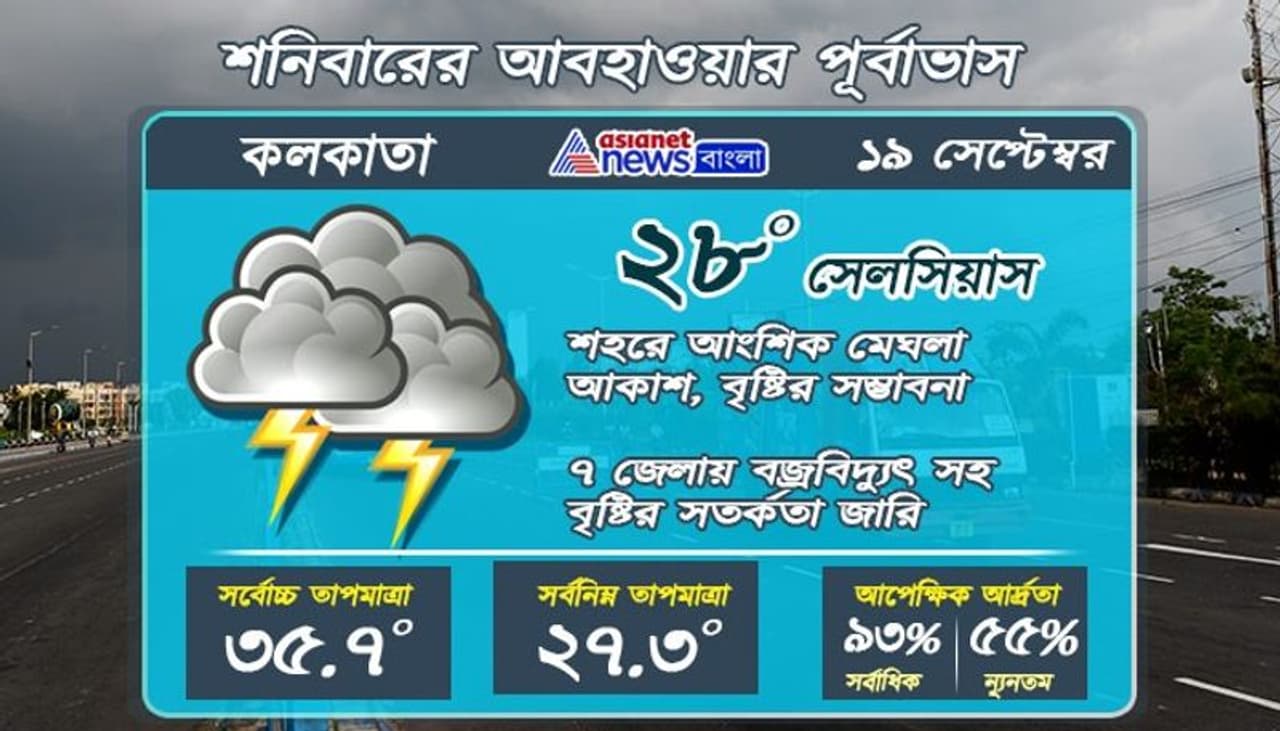 শনিবার শহর ও শহরতলির আকাশ সারাদিনই আংশিক মেঘলা থাকবে। শনিবার বজ্রবিদ্যুৎ সহ বৃষ্টির পূর্বাভাস। তবে রবিবার উত্তর-পূর্ব বঙ্গোপসাগরে নিম্নচাপ তৈরি হবে। নিম্নচাপের অভিমুখ গাঙ্গেয় পশ্চিমবঙ্গ। এর প্রভাবে রবিবার থেকে মঙ্গলবার পর্যন্ত ভারী থেকে অতি ভারী বৃষ্টির হলুদ সর্তকতা গাঙ্গেয় পশ্চিমবঙ্গে। রবিবার বিকেলের মধ্যে মৎস্যজীবীদের গভীর সমুদ্র থেকে ফিরে আসতে অনুরোধ। রবিবার সন্ধ্যে থেকে মৎস্যজীবীদের সমুদ্রে যেতে নিষেধ করা হচ্ছে। অপরদিকে, দিল্লির মৌসম ভবন জানিয়েছে, আগামী দুদিন আন্দামান ও নিকোবর দ্বীপপুঞ্জ, অন্ধ্র উপকূল ,তেলেঙ্গানা ও কর্ণাটক কেরালাতে ভারী বৃষ্টির পূর্বাভাস।