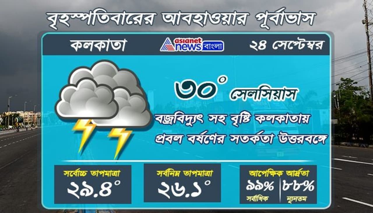 হাওয়া অফিস জানিয়েছে, বৃহস্পতিবারও উত্তরবঙ্গে অতিবৃষ্টির সর্তকতা। উত্তরবঙ্গে ভারী বৃষ্টি চলবে শনিবার পর্যন্ত। দক্ষিণবঙ্গে বজ্রবিদ্যুৎ সহ বিক্ষিপ্ত বৃষ্টি। উত্তরবঙ্গের জলপাইগুড়ি আলিপুরদুয়ার কোচবিহারে প্রবল বৃষ্টির সম্ভাবনা। জারি করা হয়েছে অতিবৃষ্টির কমলা সর্তকতা। দার্জিলিং কালিম্পং এর ভারী বৃষ্টির সর্তকতা। শুক্র-শনিবারও দার্জিলিং, কালিম্পং, আলিপুরদুয়ার, কোচবিহার ও জলপাইগুড়ি জেলায় ভারী বৃষ্টির সর্তকতা।দক্ষিণবঙ্গে বিক্ষিপ্ত বজ্রবিদ্যুৎ সহ বৃষ্টি চলবে। আপাতত ভারী বৃষ্টির সম্ভাবনা নেই তবে হালকা থেকে মাঝারি বৃষ্টি হতে পারে। বৃহস্পতিবার কলকাতায় সকালে মেঘলা আকাশ পরে আংশিক মেঘলা আকাশ। কয়েক দফায় বজ্রবিদ্যুৎ সহ বৃষ্টির সম্ভাবনা। বৃষ্টি না হলে আর্দ্রতা জনিত অস্বস্তি চরমে উঠবে।