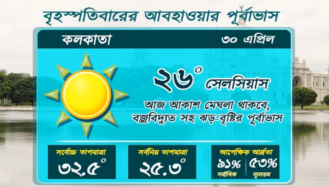 কলকাতায় সহ বঙ্গ বৃহস্পতিবার সারাদিন মেঘের আড়ালেই থাকবে। বাতাসে আদ্রতা বাড়ার দরুণ গরম অনুভূত হওয়ার আশঙ্কা রয়েছে।আবহাওয়া দফতরের খবর অনুযায়ী,বৃহস্পতিবার কলকাতার সর্বনিম্ন তাপমাত্রা ২৫.৩ ডিগ্রি সেলসিয়াস। আগামী ২৪ ঘণ্টায় উত্তরবঙ্গের জেলাগুলিতে ৩০ থেকে ৪০ কিলোমিটার গতিবেগে ঝড়ো হাওয়া সঙ্গে বজ্রবিদ্যুৎ-সহ বৃষ্টিপাতের সম্ভাবনা।দার্জিলিং, কালিম্পং, জলপাইগুড়ি ও উত্তর দিনাজপুরে ভারী বৃষ্টি অর্থাৎ ৭০ থেকে ১১০ মিলিমিটার বৃষ্টিপাতের পূর্বাভাস।দক্ষিণবঙ্গের জেলাগুলিতেও ৩০ থেকে ৪০ কিলোমিটার গতিবেগে ঝড়ো হাওয়া সঙ্গে বজ্রবিদ্যুৎ-সহ হালকা থেকে মাঝারি বৃষ্টিপাতের সম্ভাবনা।
