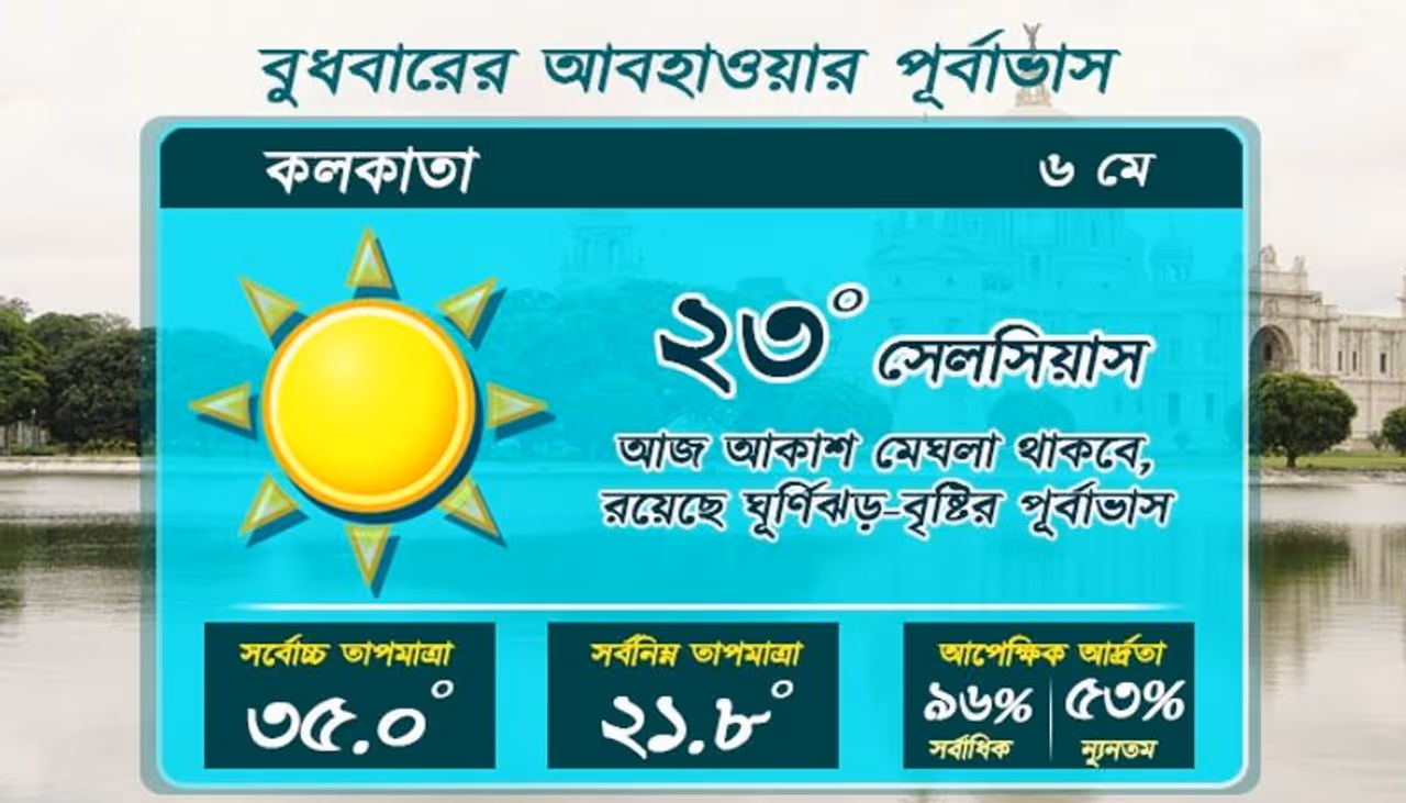 বুধবার সর্বনিম্ন তাপমাত্রা ২১.৮ ডিগ্রি সেলসিয়াস আগামী ৩ দিনও রাজ্যজুড়ে বৃষ্টির সম্ভাবনা ৫০ কিলোমিটার বেগে ঝড় হওয়ার সম্ভাবনা মৎস্যজীবীদের জন্য আপাতত সতর্ক বার্তা নেই