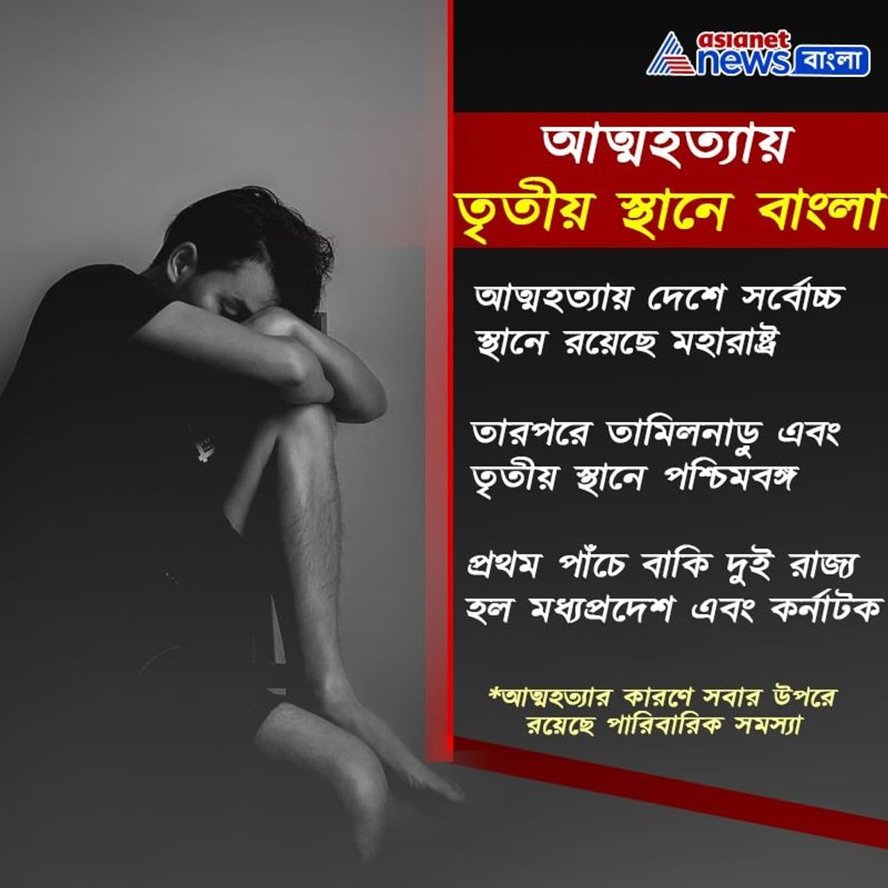 দেশ তথা রাজ্যে নিরন্তর আত্মহত্য়ার পথে হেঁটেছে অগুণতি মানুষ। সেই তালিকায় সাধারণ থেকে সেলেব কেউ বাদ যায়নি। কেউবা নিজে হাতে লিখেই মৃত্যুর আগে কারণ জানিয়ে গিয়েছে। কারও আবার ময়নাতদন্তে রিপোর্টে উঠে এসেছে আত্মহত্য়ার আসল কারণ। তবে ৩২.৪ শতাংশ আত্মহত্যার জন্য পারিবারিক কারণ দায়ী। এবং আত্মহত্যার সংখ্যা প্রায় প্রতিবছরই বেড়ে চলেছে।এনসিআরবি-র তথ্য অনুযায়ী, আত্মহত্যায় দেশে সর্বোচ্চ স্থানে রয়েছে মহারাষ্ট্র। তার পরে তামিলনাড়ু এবং তৃতীয় স্থানে পশ্চিমবঙ্গ।