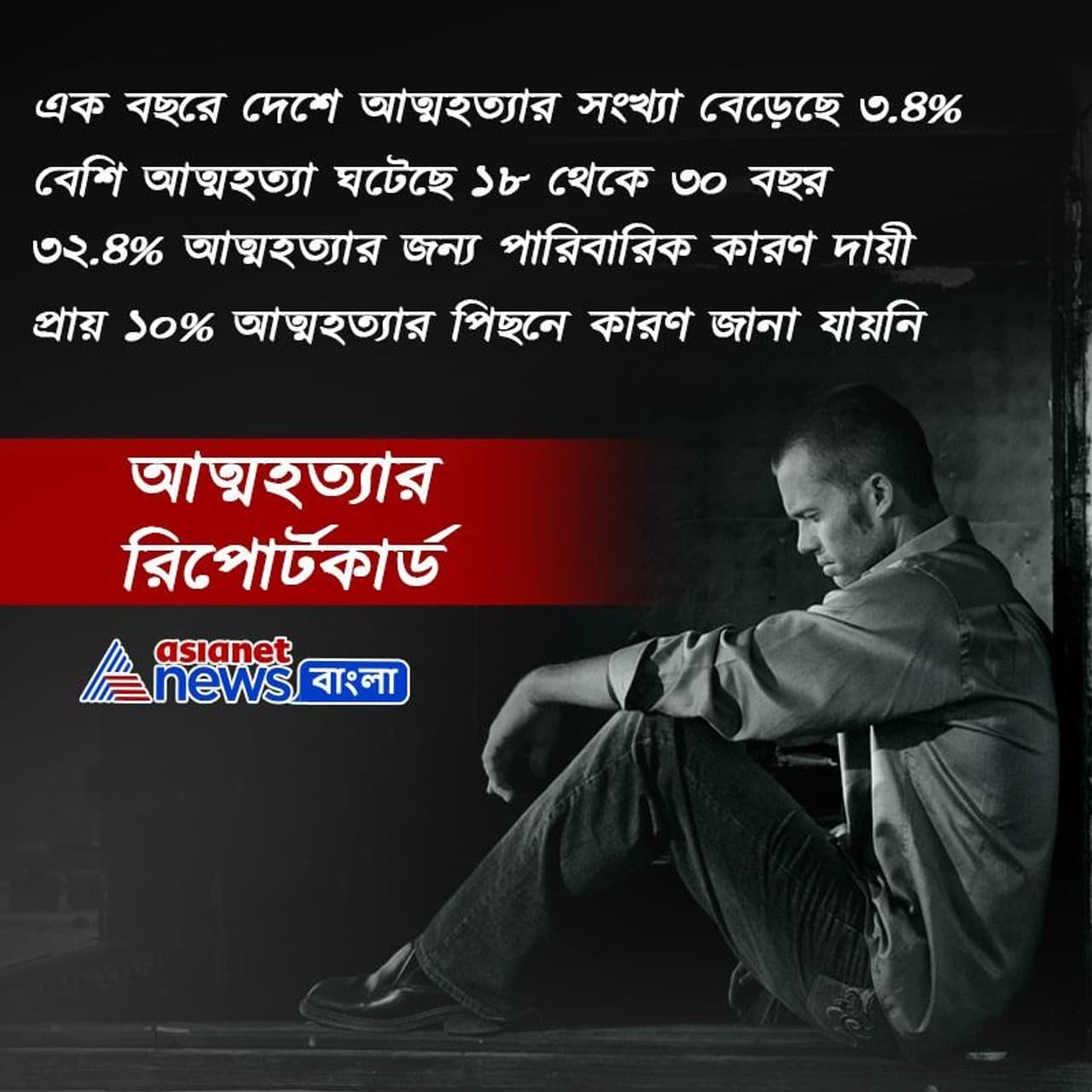 এক বছরে দেশে আত্মহত্যার সংখ্যা বেড়েছে ৩.৪ শতাংশ ৩২.৪ শতাংশ আত্মহত্যার জন্য পারিবারিক কারণ দায়ী প্রায় ১০ শতাংশ আত্মহত্যার পিছনে কারণ জানা যায়নি বেশি আত্মহত্যা ঘটেছে ১৮ থেকে ৩০ বছর বয়সীদের মধ্যে