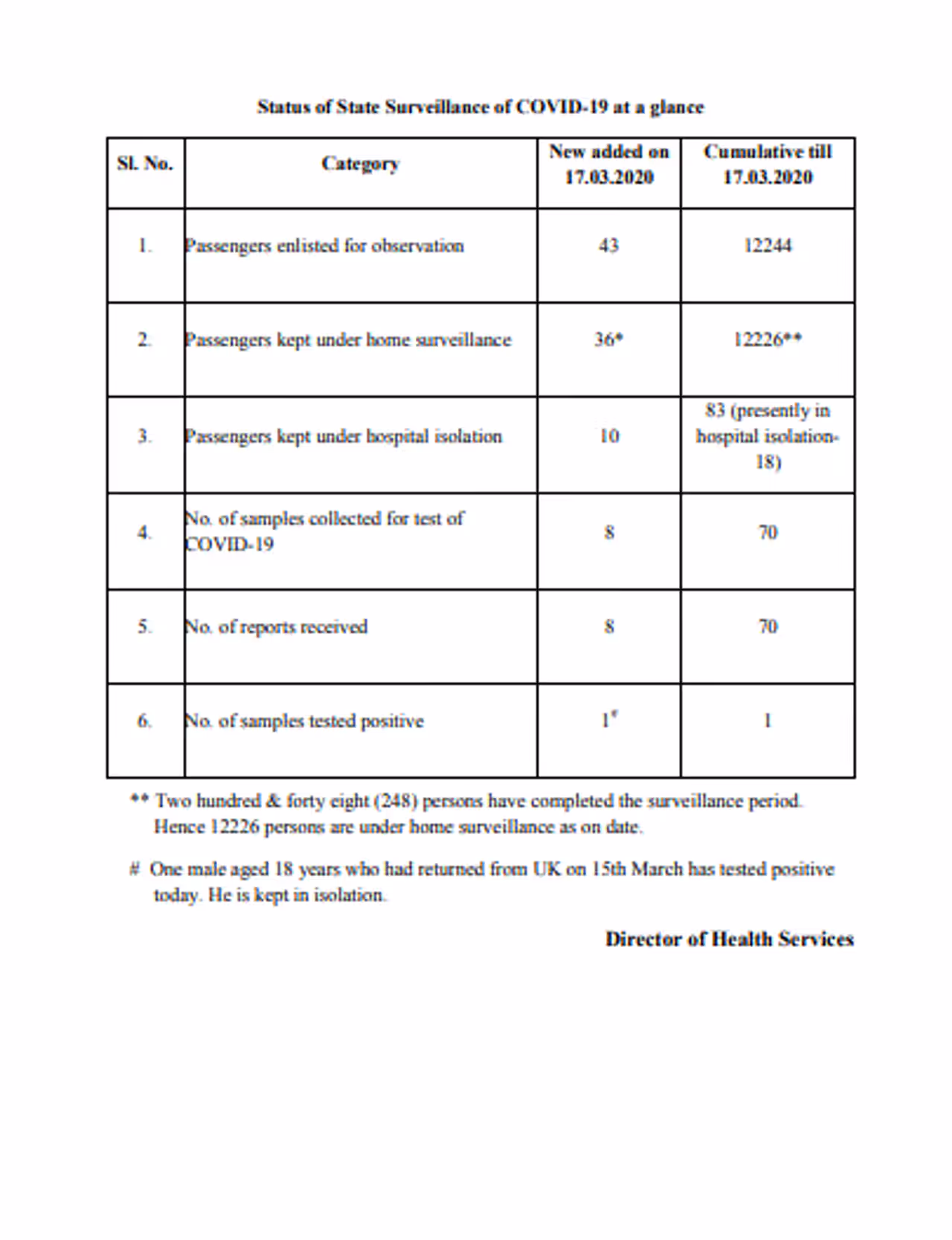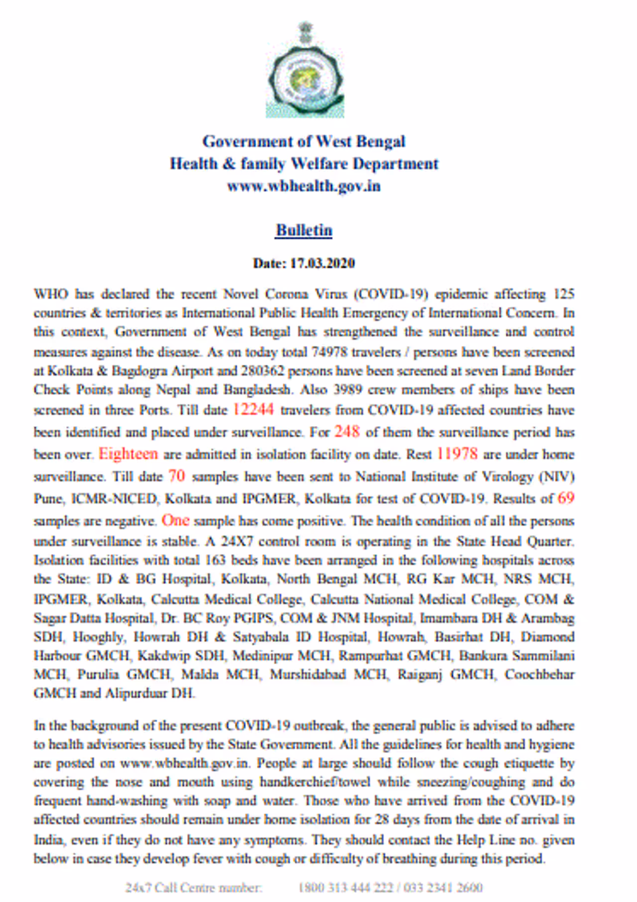 বর্তমানে ওই তরুণ ছাড়াও করোনার নানা উপসর্গ নিয়ে আইডি হাসপাতালের আইসোলেশন ওয়ার্ডে ভর্তি রয়েছেন ১৮ জন ৷এদিকে করোনা মোকাবিলায় একাধিক সতর্কতামূলক পদক্ষেপ করেছে পশ্চিমবঙ্গ সরকার৷ সতর্কতামূলক ব্যবস্থা হিসেবে আগামী ১৫ এপ্রিল পর্যন্ত রাজ্যের সব শিক্ষা প্রতিষ্ঠান বন্ধ রাখার সিদ্ধান্ত নিয়েছেন মুখ্যমন্ত্রী মমতা বন্দ্যোপাধ্যায়৷ রাজ্যের সব সিনেমা হল ও অন্য প্রেক্ষাগৃহগুলিও আপাতত ৩১ মার্চ পর্যন্ত বন্ধ রাখার আবেদন জানান হয়েছে৷ করোনা মোকাবিলায় সোমবারই ২০০ কোটি টাকার তহবিল গড়ার ঘোষণা করেছেন মুখ্যমন্ত্রী৷