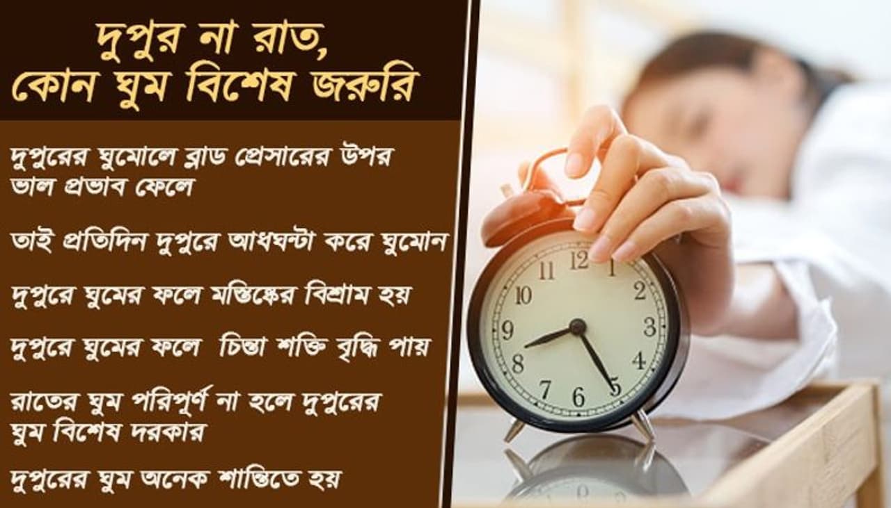 দুপুরে খাওয়ার পর অনেকেরই মনে হয় বিছানায় একটু শুলে ভাল হয়। কর্মজীবীরা অনেকসময়ে অফিসের মধ্যেই পাঁচ-দশ মিনিট নিজের চেয়ারেই মাথা নীচু করে ঘুমিয়ে নেন। সারাদিনে কাজের পর শরীরে যেন ক্লান্তি আসে। আর এই ক্লান্তি দূর করার জন্য একটু ঘুমের প্রয়োজন হয়। কিন্তু এই ঘুম নিয়ে নানা বির্তক রয়েছ। কেউ বলে দুপুরে ঘুমানো শরীরের জন্য খারাপ, কেউ বলে মেদ জমে। আবার কেউ কেউ বলে দুপুরের এই ঘুম শরীরের জন্য ভাল।