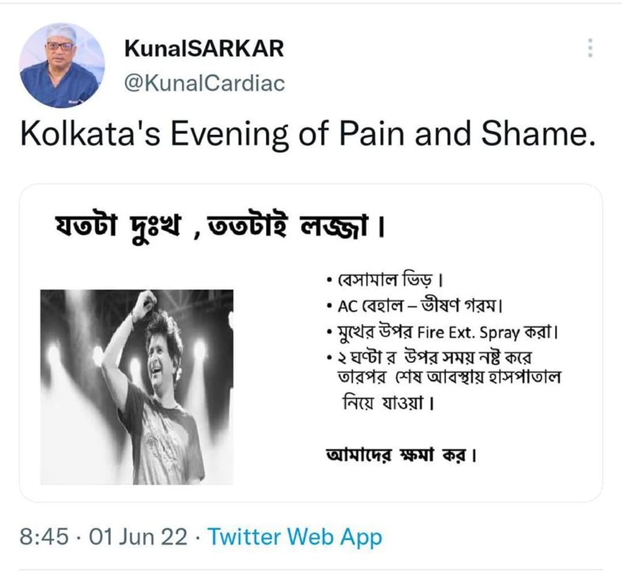 এই বিষয়ে বিশিষ্ট চিকিৎসক কুণাল সরকার মন্তব্য করেছেন, 'এই ঘটনা যতটাই দুঃখজনক ততটাই লজ্জার।' এই ঘটনার কারণ হিসেবে তিনি দায়ী করেছেন বেসামাল ভীড়, প্রচণ্ড গরম সেই সঙ্গে বেহাল এসি, শিল্পীর মাথার উপর ফায়ার এক্সিটিঙ্গিউসার স্প্রে করা, অনুষ্ঠান শেষে সরাসরি হাসপাতালে না নিয়ে গিয়ে হোটেলে নিয়ে গিয়ে ২ ঘন্টা সময় নষ্ট করা। তবে কি এই এই দায়িত্বজ্ঞানহীনতার কারণেই আমরা হারালাম এই জনপ্রিয় শিল্পী-কে! এর দায় কার, উঠছে প্রশ্ন