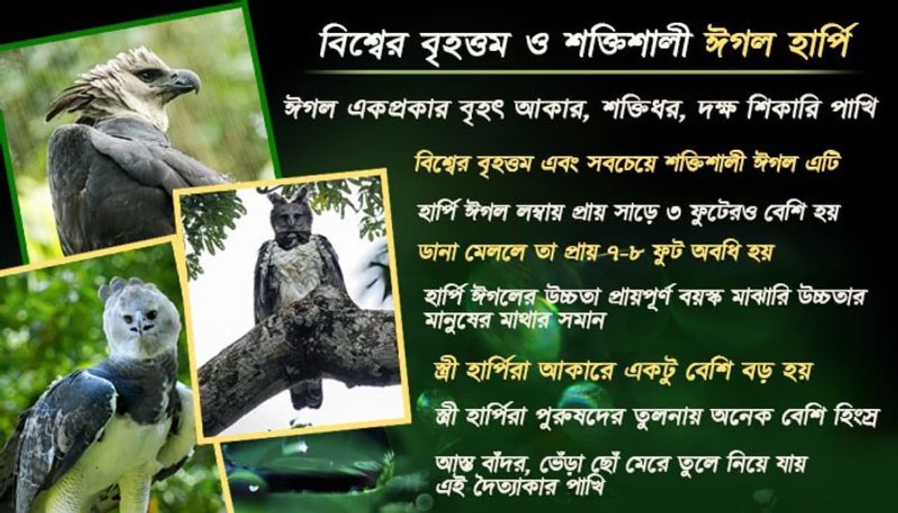 ঈগল একপ্রকার বৃহৎ আকার, শক্তিধর, দক্ষ শিকারি পাখি। বানর, ছোট জাতের পাখি, টিকটিকি, হাস-মুরগী খেয়ে এরা জীবনধারণ করে। একটি পূর্ণবয়স্ক ঈগলের ওজন প্রায় ৩০ কেজি এবং লম্বায় প্রায় এরা ৩০-৩৫ ইঞ্চি হয়ে থাকে। জানলে অবাক হবেন একটি পূর্ণবয়স্ক সুস্থ ঈগল ১১,০০০ ফুট উপরে উঠতে পারে। এরা সাধারণত জনমানব এলাকার বাইরে এবং কমপক্ষে ১০০ ফুট উপরে বাসা তৈরি করে প্রজনন ঘটায়। ঈগল-এর জীবন রক্ষার বড় হাতিয়ার তাদের পায়ের নখ। তাঁদের নখগুলো এতই তীক্ষ্ণ যে নিমিষের মধ্যে শিকারকে ছিন্নভিন্ন করতে সক্ষম। তবে বর্তমানে এরা বিলুপ্তির পথে।