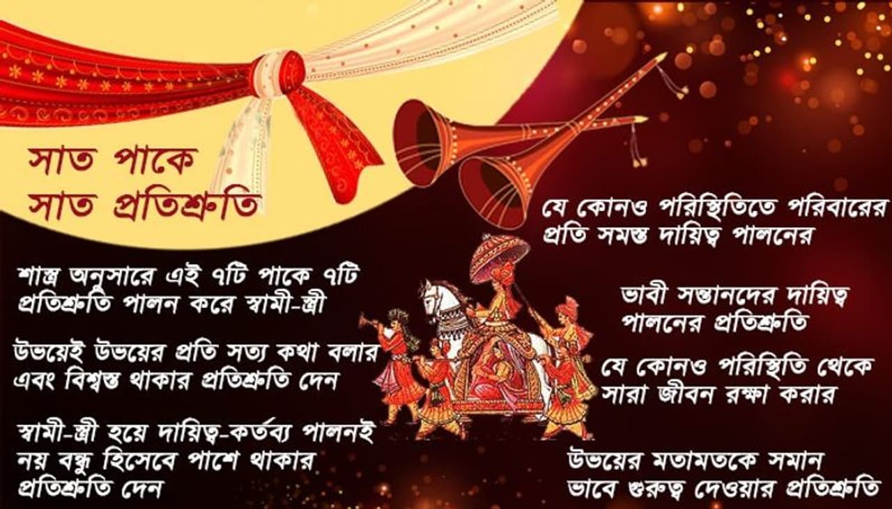 এই নিয়ম অনুসারে অগ্নিকুণ্ডকে সাক্ষী রেখে পাত্র-পাত্রী আগুনের চারপাশে ঘোরে। শাস্ত্র অনুসারে এই ৭টি পাকে ৭টি প্রতিশ্রুতি পালন করে স্বামী-স্ত্রী। জেনে নিন এই ৭ পাকের ৭টি প্রতিশ্রুতির কথা।