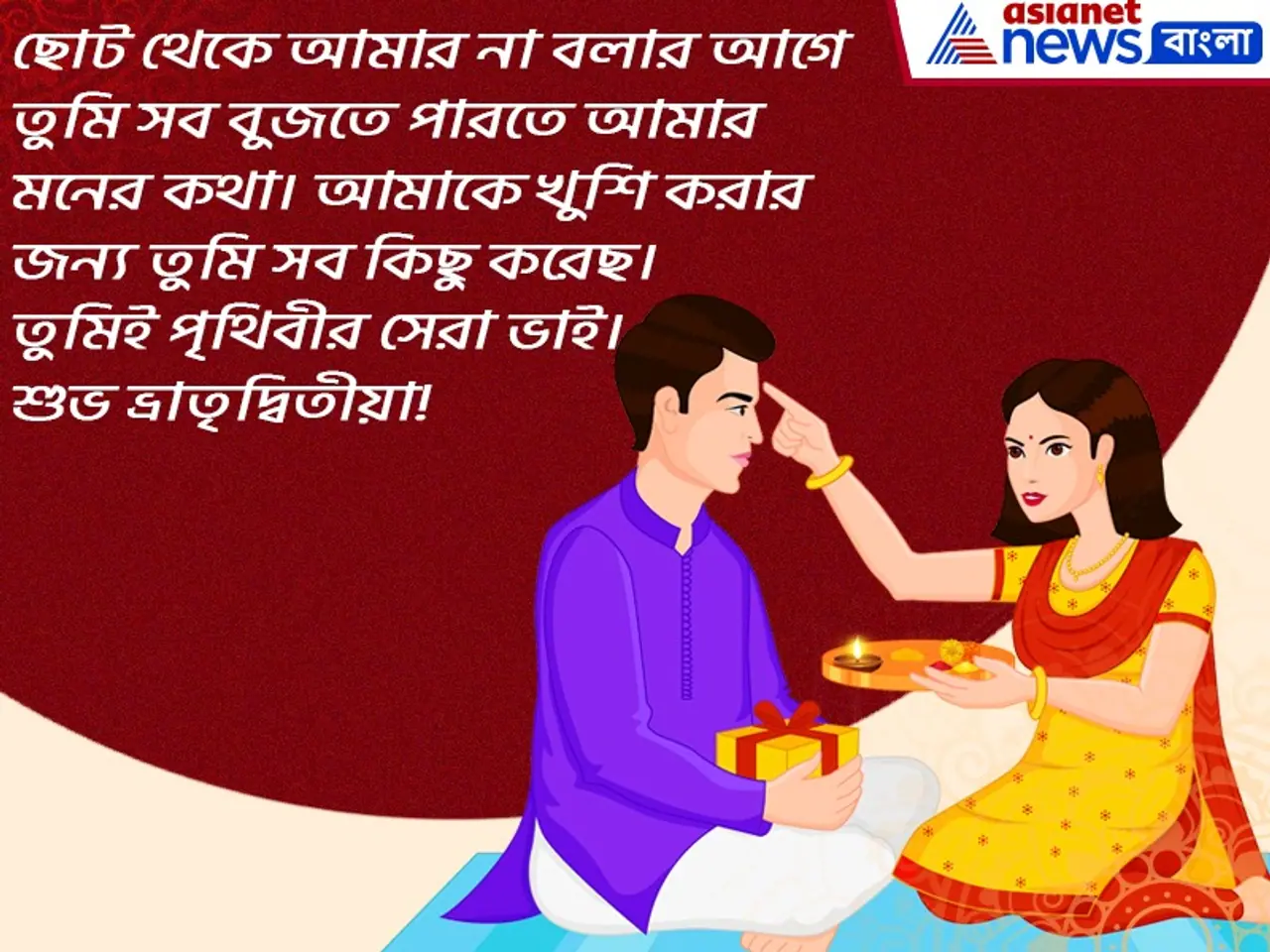আজকের ভাইবোনের এই শুভ দিনে তোমাকে জানাই ভাইফোঁটার শুভেচ্ছা এবং অনেক ভালোবাসা। এইভাবে জীবনে চলার জন্য সাহস ও ভরসা দিও। আশা করব এই ভ্রাতৃদ্বিতীয়া আমাদের বন্ধন আরও দৃঢ় করে তুলবে!