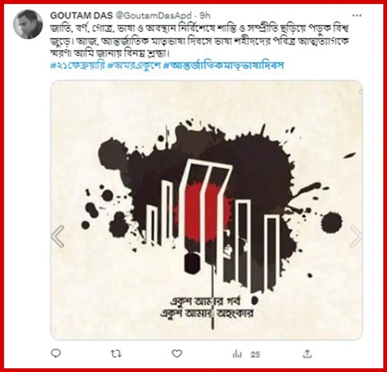অনেকেই আবার জাতি বর্ণের বিদ্বেশ ভুলে বাংলা ভাষাকে শীর্ষে রাখার অনুরোধ করেছেন। ভাষা দিবসে শহিদদের আত্মত্যাগ যাতে কোনওভাবেই বিফলে না যায় তার দায়িত্ব প্রতিটি বাঙালির। যারা বাংলা ভাষাকে জাতীয় স্বিকৃতি দিয়ে গিয়ে নিজেদের জীবন দিয়েছেন, আমরা কোনও ভাবেই এই ভাষার যেন অসম্মান না করি, এমন অনুরোধও করেছেন বহু বাঙালি।