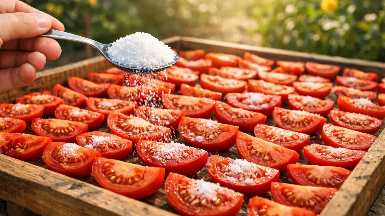 কেটে রাখা টমেটোগুলোর ওপর অল্প করে নুন ছড়িয়ে দিন। নুন টমেটোর ভেতরের বাড়তি জল বের করে দেয়। এর ফলে টমেটো তাড়াতাড়ি শুকায় এবং এতে ব্যাকটেরিয়া বা ফাঙ্গাস জন্মানোর সম্ভাবনাও কমে যায়।