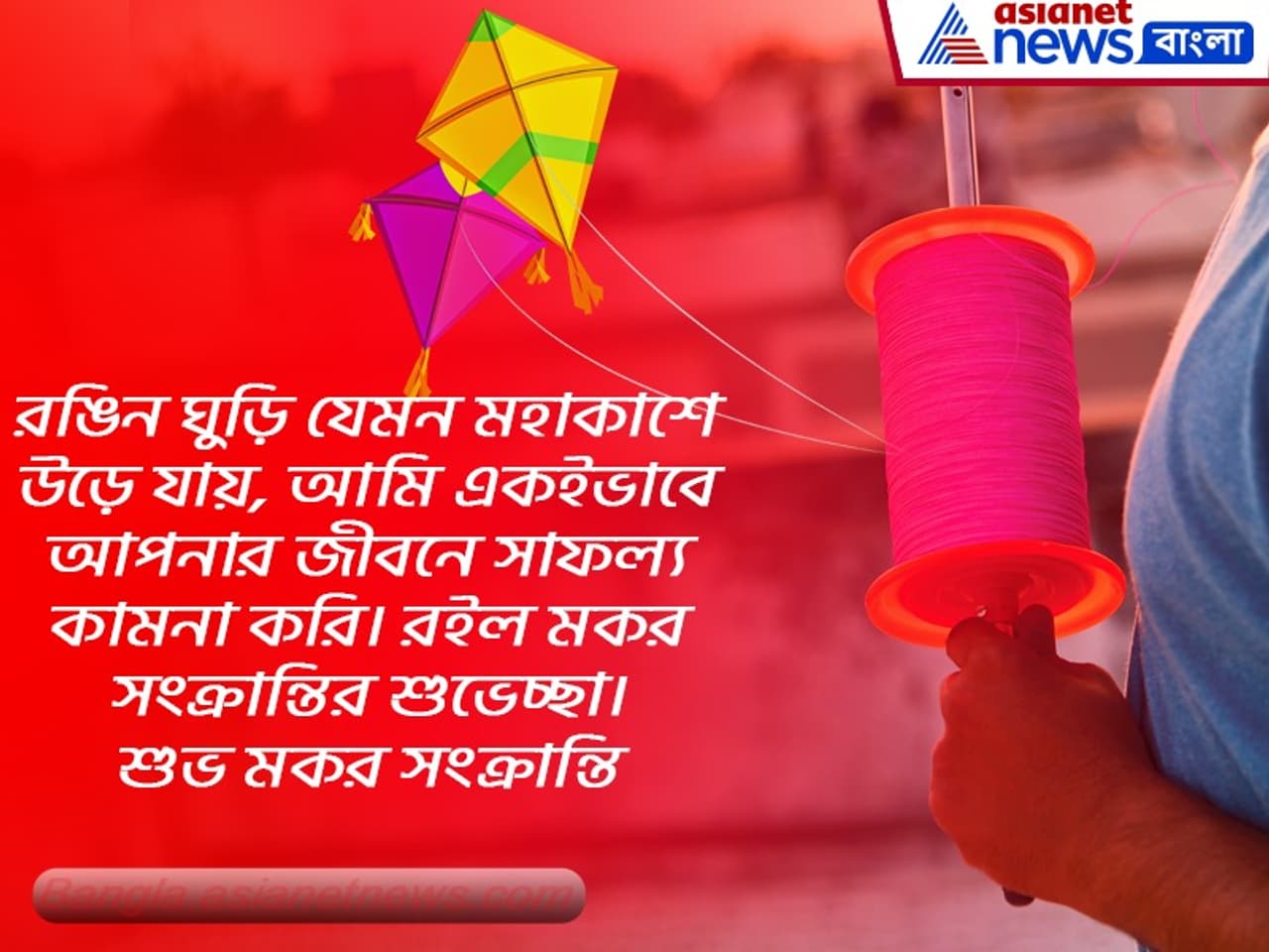 রঙিন ঘুড়ি যেমন মহাকাশে উড়ে যায়, আমি একইভাবে আপনার জীবনে সাফল্য কামনা করি। রইল মকর সংক্রান্তির শুভেচ্ছা। শুভ মকর সংক্রান্তি। - জানান এমন শুভেচ্ছা বার্তা। পৌষ সংক্রান্তি বা মকর সংক্রান্তি বাঙালির এই বিশেষ উৎসব। বাংলা পৌষ মাসের শেষের দিন এই উৎসব পালন করা হয়।
