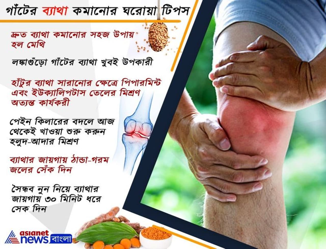 শীত আসতে না আসতেই ব্যথা ব্যথা অনুভব শুরু হচ্ছে। বিশেষত রাত বাড়ার সঙ্গে সঙ্গে ব্যথাটা যেন ক্রমশ বাড়ছে। হাঁটু বা গাটের ব্যথা র সমস্যা নিয়ে জেরবার হয়ে পড়ছেন। অনেকেরই সারা বছর এই ব্যথা কমবেশি হয়ে থাকে। কিন্তু শীতকাল আসা মাত্রই ব্যথাটা যেন দ্বিগুন হয়ে যায়। আর তখনই পেইন কিলারের উপর প্রত্যেকেই যেন আসক্ত হয়ে পড়ি। কিন্তু বেশি পেইন কিলার খাওয়া শরীরের জন্য যথেষ্ঠ ক্ষতিকর। তাই ওষুধ ভুলে বাড়ির টোটকাতেই ভরসা রাখুন। জেনে নিন জয়েন্ট পেন সারানোর কয়েকটি অব্যর্থ উপায়।