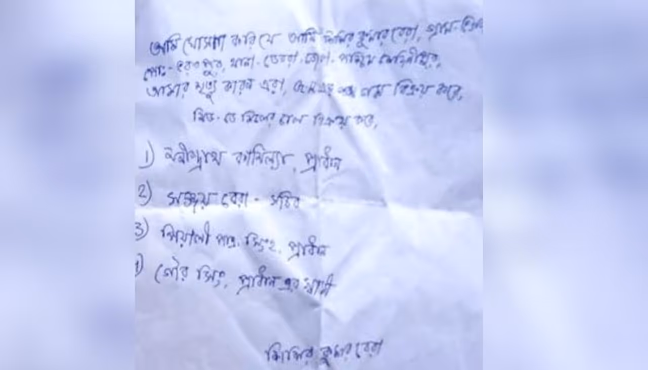 মৃতের নাম শিশিরকুমার কুমার বেরা। বাড়ি, ডেবরার ভগবানপুরে গ্রামে। ভগবানপুর গ্রামটি যে পঞ্চায়েতের অন্তর্গত, সেই ভরতপুর গ্রাম পঞ্চায়েতের কর্মী ছিলেন শিশির। বৃহস্পতিবার সকালে বাড়ি থেকে কিছুটা দূরে এ একটি গাছে তাঁর ঝুলন্ত দেহ দেখতে পান স্থানীয় বাসিন্দারা। মৃতের পকেট থেকে একটি সুইসাইড নোটও উদ্ধার করেছে পুলিশ। আর তাতেই শোরগোল পড়ে গিয়েছে এলাকায়।