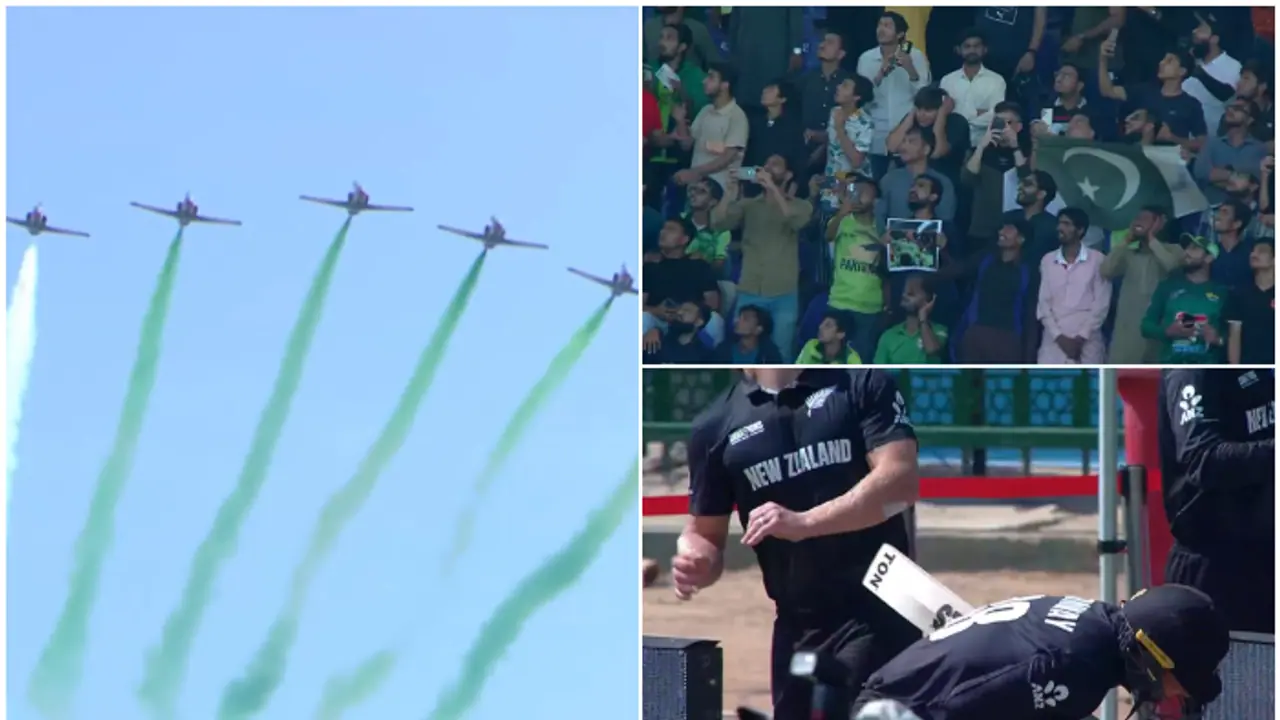 আইসিসি চ্যাম্পিয়ন্স ট্রফির উদ্বোধনী ম্যাচ চলাকালীন স্টেডিয়ামের উপর দিয়ে পাকিস্তানি জেট বিমান উড়ে যাওয়ায় রীতিমতো হতবাক হয়ে যান নিউজিল্যান্ড তারকারা। শুধু তারকারাই নন, করাচি জাতীয় স্টেডিয়ামে উপস্থিত পাকিস্তানি সমর্থকরাও কার্যত, অবাক হয়ে যান। টসে হেরে নিউজিল্যান্ড ব্যাটিংয়ে নামার সময় স্টেডিয়ামের উপর দিয়ে সেই জেট বিমানগুলি উড়ে যায়।