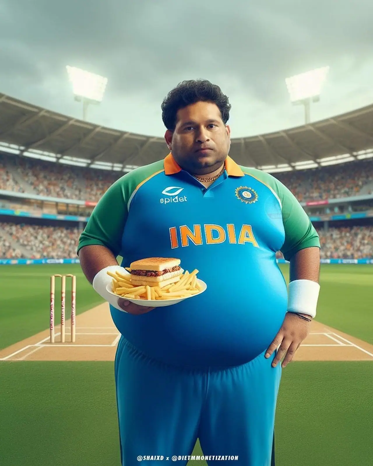 হাতে রয়েছে ফ্রেঞ্চ ফ্রাই ও বার্গা। প্লেট ভর্তি সুস্বাদু ও অস্বাস্থ্যকর খাবার হাতে দাঁড়িয়ে সচিন তেন্ডুলকর। AI Images এ দেখা যাচ্ছে এমন খাবার খেয়ে বেশ কয়েক কিলো বাড়িয়েছেন এই ক্রিকেট তারকা।