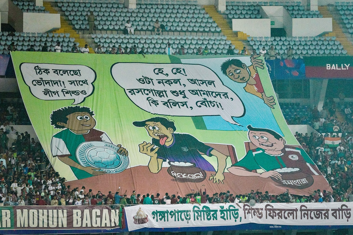 শুধু তাই নয়, ‘হে হে! ওটা নকল, আসল রসগোল্লা শুধু আমাদের, কি বলিস, বোঁচা!’ এমনকি, এনএফএল, আই লিগ এবং আইএসএল শিল্ড চ্যাম্পিয়ন লিখে ‘Then Now Forever’ লেখা টিফোও দেখা গেল।