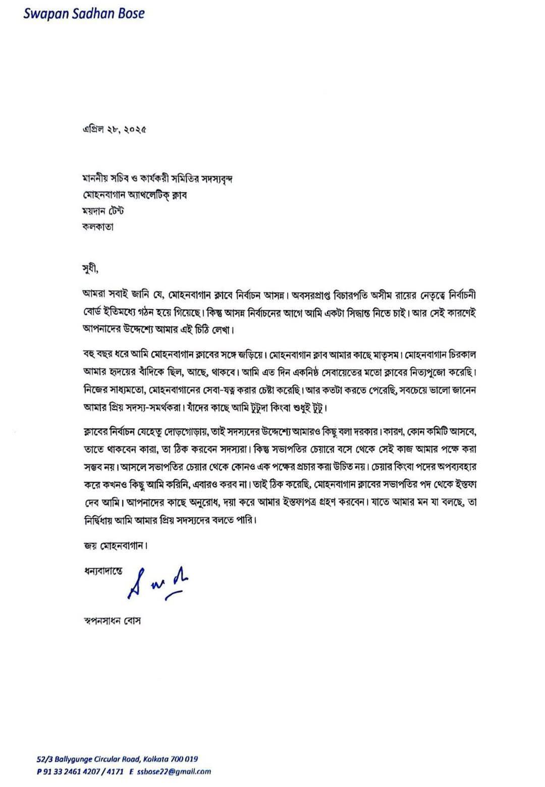 প্রসঙ্গত, সবুজ মেরুনের নির্বাচনে এবার জোরালোভাবে লড়াইতে আছেন সৃঞ্জয় বসু। এদিন টুটু বসু নিজের ইস্তফাপত্রে লিখেছেন, “ক্লাবের নির্বাচন যেহেতু দোরগোড়ায়, তাই সদস্যদের প্রতি আমারও কিছু বলার দরকার আছে। কোন কমিটি আসবে এবং তাতে কারা কারা থাকবেন, সেটা সদস্যরা সবাই মিলে ঠিক করবেন। কিন্তু সভাপতির চেয়ারে বসে থেকে সেই কাজ আমার পক্ষে করা সম্ভব নয়। সভাপতির চেয়ারে বসে থেকে কোনও একটি পক্ষের হয়ে প্রচার করা উচিত নয়। কারণ, চেয়ার বা পদের অপব্যবহার করে কখনও কিছু আমি করিনি। এবারও আমি তা করব না। তাই ঠিক করেছি, মোহনবাগান ক্লাবের সভাপতির পদ থেকে ইস্তফা দেব আমি। দয়া করে আমার ইস্তফাপত্র গ্রহণ করবেন। যাতে আমার মন যা বলছে, তা আমি নির্দ্বিধায় প্রিয় সদস্যদের বলতে পারি।”
