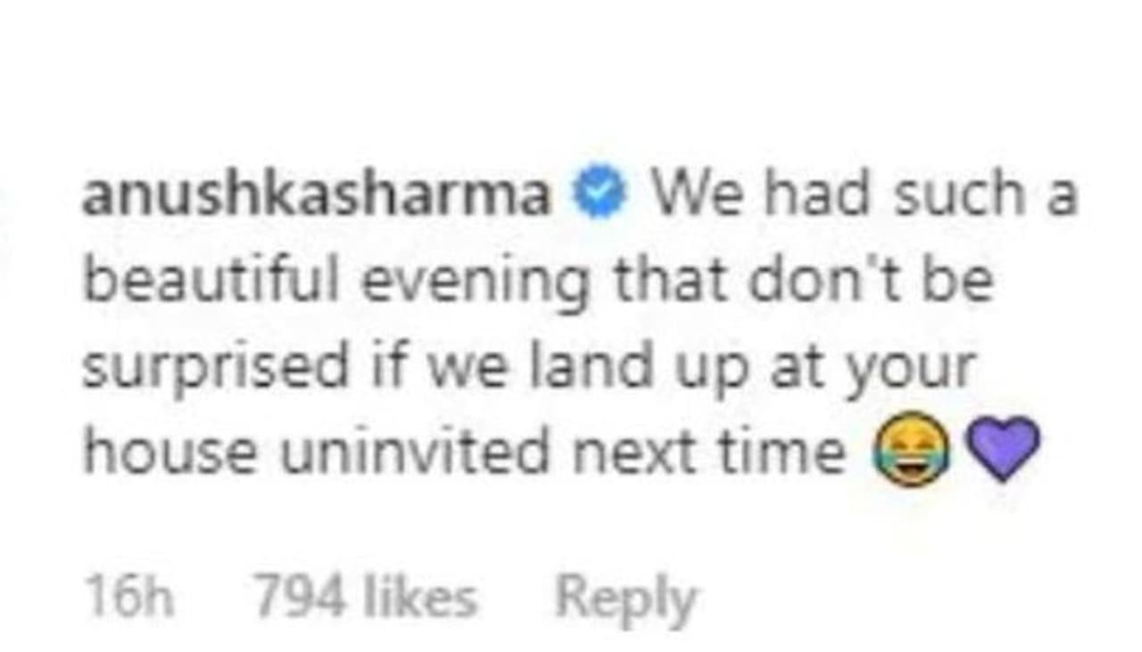 সোশ্যাল মিডিয়ায় সোনমের পোস্ট করা ছবির নিচে কমেন্টও করেছেন অনুষ্কা শর্মা। বিরাটপত্নী লিখেছেন, 'তোমাদের সঙ্গে আমরা খুবই ভাল একটা সন্ধে কাটালাম। যদি পরেরবার বিনা নিমন্ত্রণেই তোমাদের বাড়ি চলে যাই, অবাক হোয়ো না।'