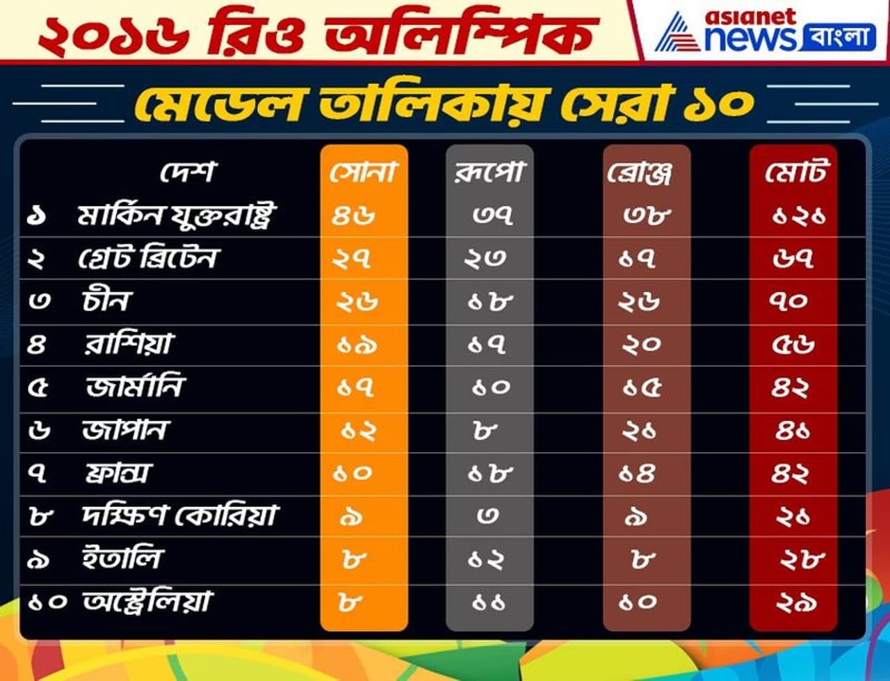 রিও অলিম্পিক্সে আমেরিকা সব থেকে বেশি মোট ৪৬টি সোনা জিতেছিল। রিও গেমসে ৫৯টি দেশ অন্তত একটা করে সোনা জিতেছিল। এর আগে অলিম্পিক্সে এত দেশ কখনও সোনা জেতেনি। ৯টা দেশ রিওকে অলিম্পিকের ইতিহাসে প্রথমবার সোনা জিতেছিল। তারা ছিল সিঙ্গাপুর, ভিয়েততাম, রিকোয়া পুয়ের্তো, বাহারিন,কোসোভো, ফিজি, জর্ডন, তাজাকিস্তান, আইভরি কোস্ট। ৮৭টি দেশ অন্তত একটা পদক জিতেছিল। এটাও রেকর্ড। ২টি পদক জিতে ভারত ছিল ৬৭ নম্বরে। কিন্তু ১২০টা দেশ কোনও পদকই পায়নি। যাদের মধ্যে ছিল আমাদের প্রতিবেশী দেশ বাংলাদেশ, পাকিস্তানও। আসলে ভারত ছাড়া দক্ষিণ এশিয়ার বাকি সাতটা দেশের কেউই কোনও পদক জিততে পারেনি।