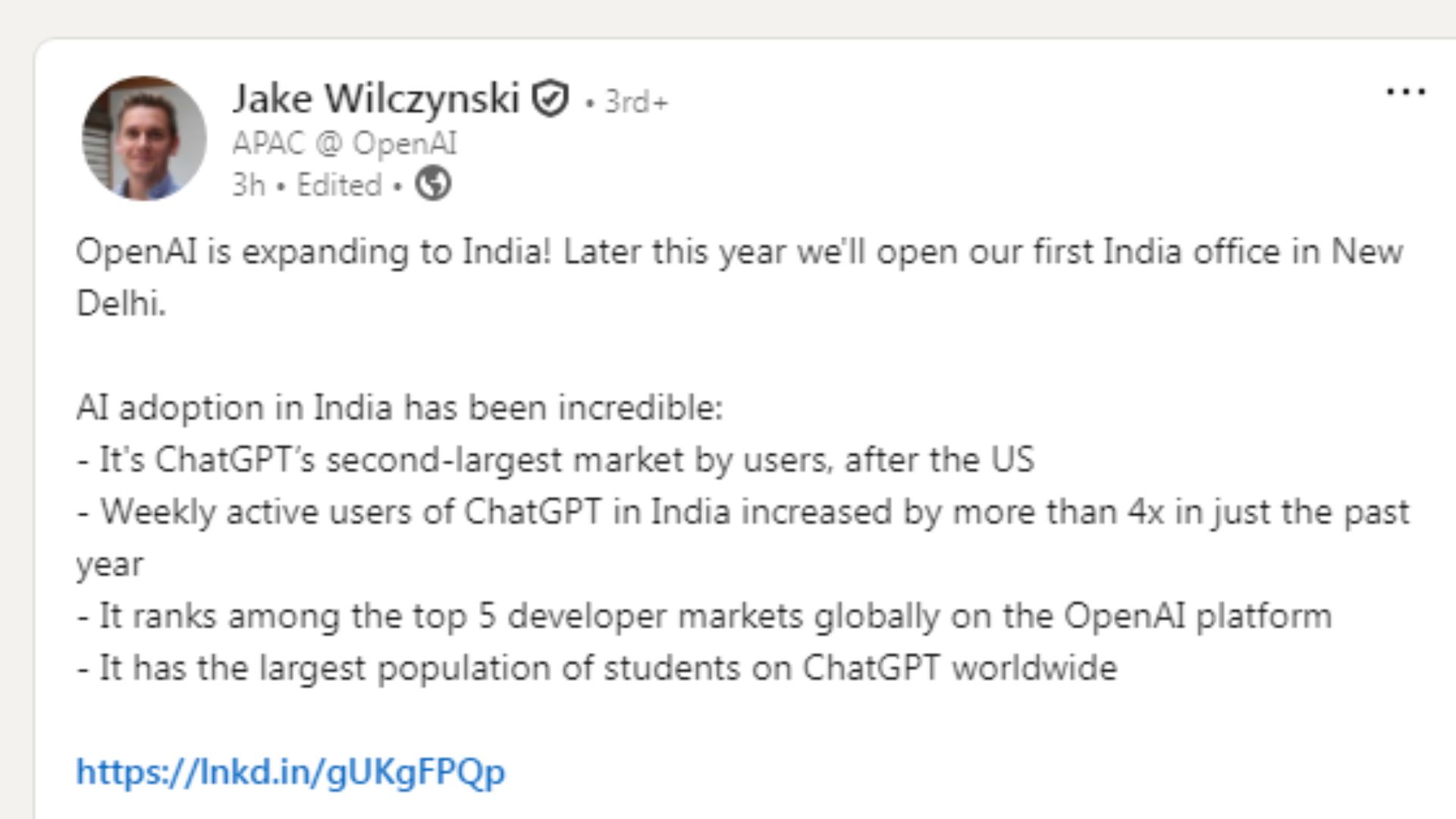 তিনি লিখেছেন, “OpenAI ক্রমশ ভারতে সম্প্রসারিত হচ্ছে। এই বছরের শেষদিকে, ভারতের বুকে আমরা নয়াদিল্লীতে প্রথম অফিসটি খুলতে চলেছি। ভারতে কৃত্রিম বুদ্ধিমত্তার গ্রহণ রীতিমতো অবিশ্বাস্য। এটি ব্যবহারকারীদের দিক থেকে ChatGPT-এর দ্বিতীয় বৃহত্তম বাজার। যা আসলে মার্কিন যুক্তরাষ্ট্রের পরেই।:গত এক বছরে ভারতে ChatGPT-এর সাপ্তাহিক সক্রিয় ব্যবহারকারীর সংখ্যা প্রায় চারগুণেরও বেশি বৃদ্ধি পেয়েছে। ওপেনএআই প্ল্যাটফর্মে এটি বিশ্বব্যাপী শীর্ষ ৫টি ডেভেলপার বাজারের মধ্যে স্থান করে নিয়েছে। গোটা বিশ্বব্যাপী ChatGPT-তে সবচেয়ে বেশি শিক্ষার্থী রয়েছে এই দেশে।"