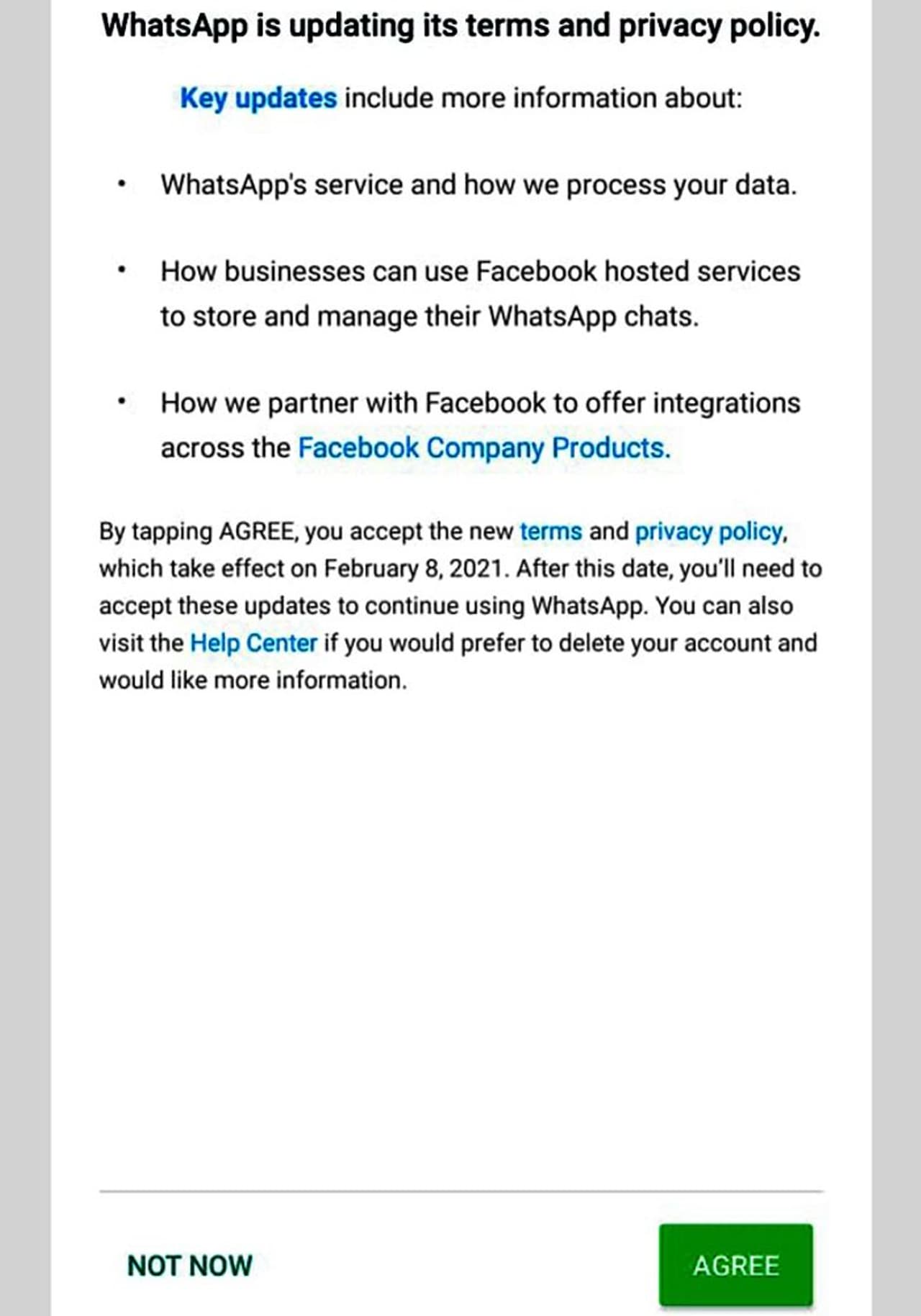 সমস্ত হোয়াটসঅ্যাপ ব্যবহারকারীদের এই নতুন নীতি অবশ্যই গ্রহণ করতে হবে। যদিও এখন পর্যন্ত নট নাউ এর অপশন পাচ্ছেন ব্যবহারকারীরা । কিন্তু কিছুদিন পর থেকে তা আর থাকবে না বলেই জানা যাচ্ছে। নতুন পলিসিতে ফেসবুক এবং ইনস্টাগ্রামের একত্রীকরণে আরও বেশি করে জোর দেওয়া হবে।