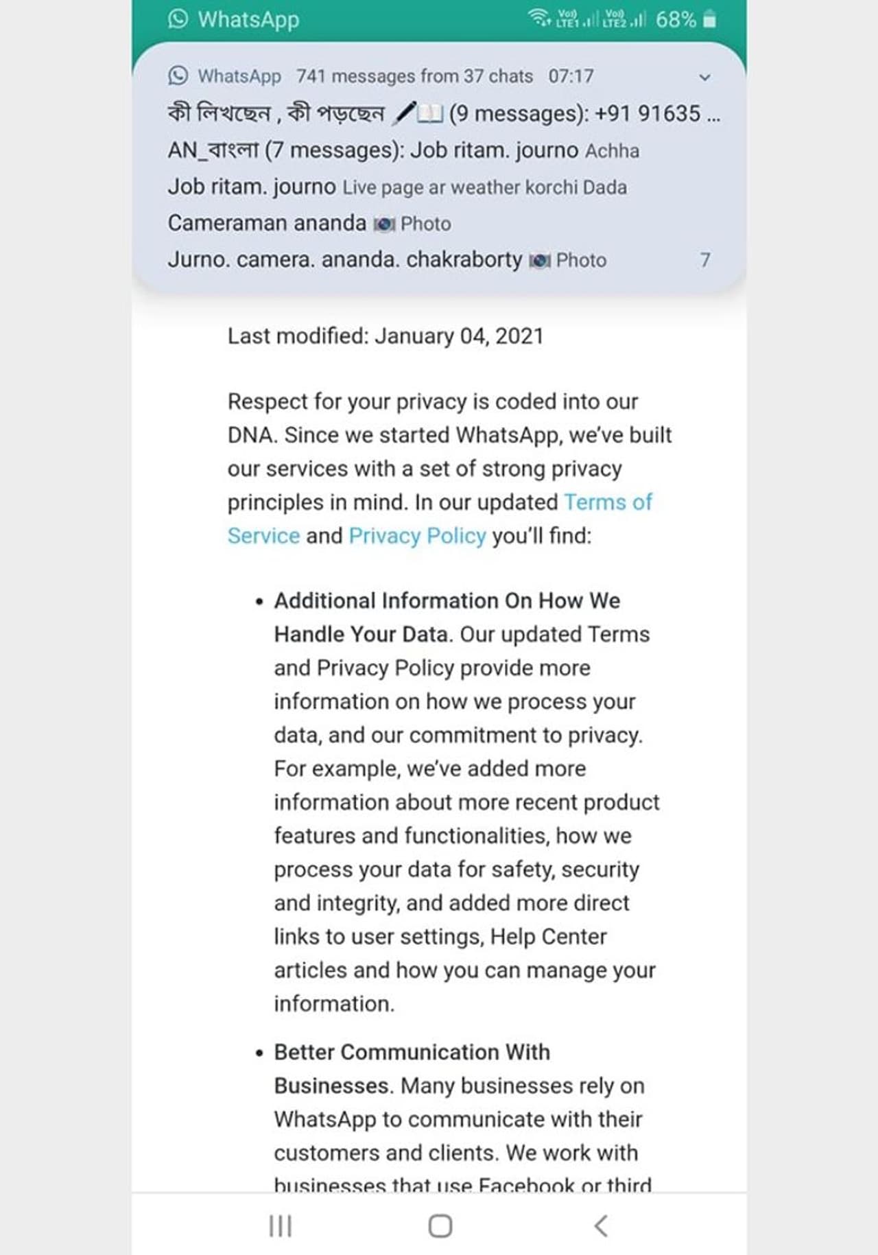 গত মঙ্গলবার থেকেই গ্রাহকরা বিজ্ঞপ্তি পেতে শুরু করেছে। অ্যান্ড্রয়েড এবং আইওএস-এ তা চলে এসেছে। বিজ্ঞপ্তিটিতে তিনটি ক্ষেত্রে আপডেটের কথা উল্লেখ করা হয়েছে। প্রথমত, হোয়াটসঅ্যাপ পরিষেবা ও গ্রাহকের তথ্য প্রসেসিং। দ্বিতীয়ত, ব্যবসা প্রতিষ্ঠানগুলি কীভাবে ফেসবুকের পরিষেবা ও হোয়াটসঅ্যাপ চ্যাট সংরক্ষণ করতে পারবে। এবং তৃতীয়ত, ফেসবুকের সঙ্গে অংশীদারি কী রকম। এই নিয়েই বাড়ছে জল্পনা।