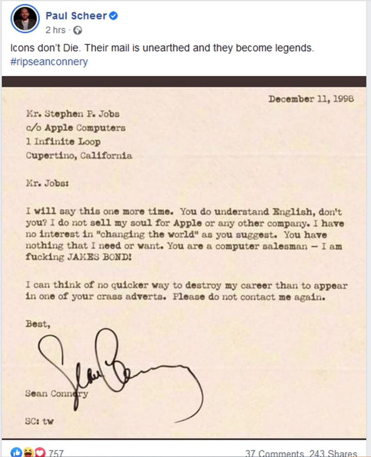 কাজেই ৯০ বছর বয়সে শন কনারির মৃত্যুর পর, স্টিভ জোবস-কে লেথা তাঁর চিঠি বলে যে চিঠির ছবি অনলাইনে ভাইরাল হয়েছে তা বস্তুত ভুয়ো, একটি ব্যঙ্গাত্মক ওয়েবসাইটে প্রকাশিত কাল্পনিক চিঠি। এমন কোনও চিঠি জোবস আর কনারির মধ্যে চালাচালি হয়নি।