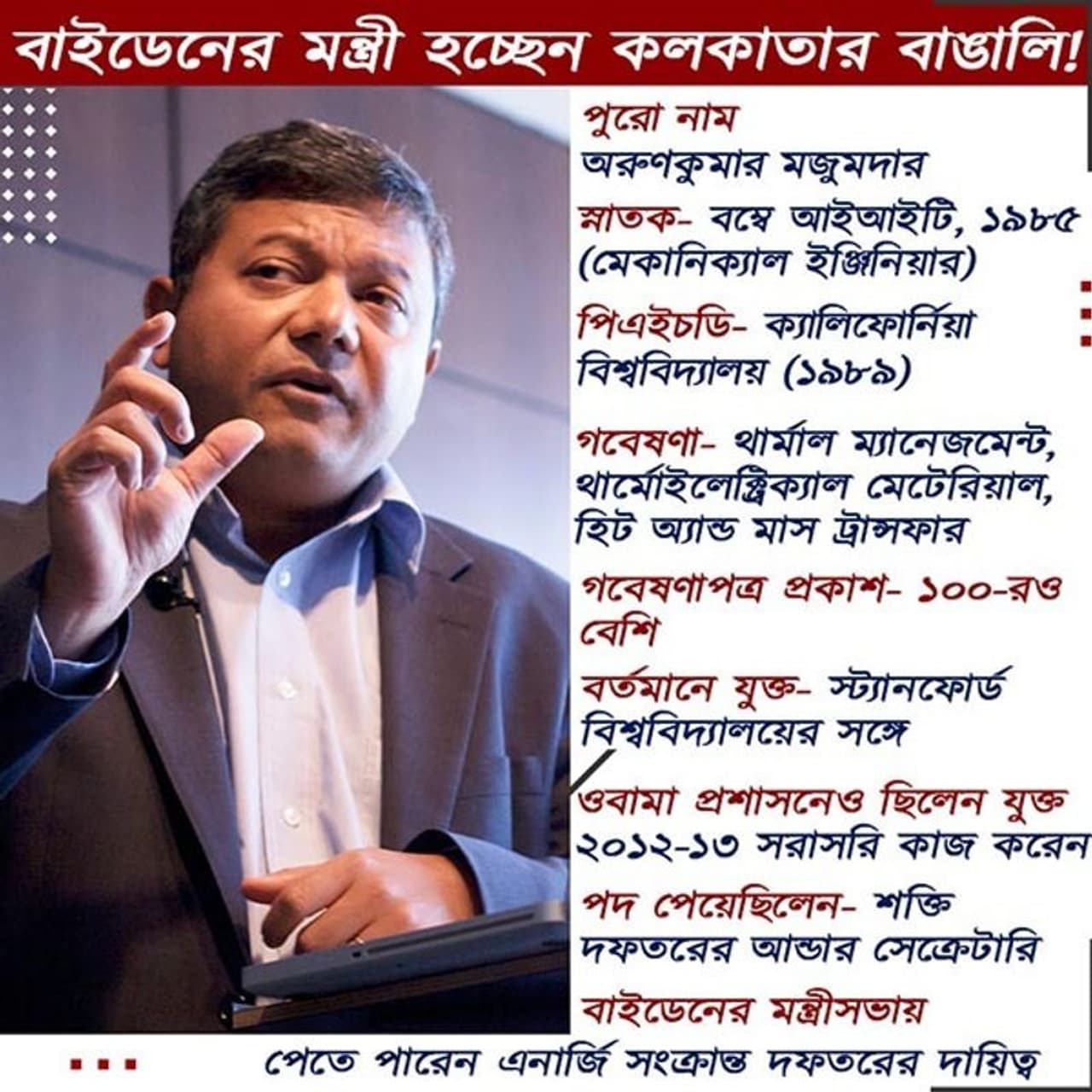 জো বাইনের মন্ত্রিসভার গুরুত্বপূর্ণ দায়িত্ব পেতে চলেছেন ভারতীয় বংশোদ্ভূত অরুণ মজুমদার।সম্ভবত তাঁকে শক্তি সচিবের দায়িত্ব দেওয়া হবে। শুধু রাজনীতি হিসেবেই বিখ্যাত নন অরুণ কুমার। এই প্রবাসী আমেরিকান বোম্বে আইআইটির ছাত্র। প্রায় ১০০টিরও বেশি গবেষণা পত্র রয়েছে তাঁর। বর্তমানে তিনি স্ট্যান্ডফোর্ড বিশ্ববিদ্যালয়ের অধ্যাপক। প্রাক্তন মার্কিন রাষ্ট্রপতি বারাক ওবামারও আস্থাভাজন ছিলেন তিনি। ডেমোক্র্যাট শীর্ষ নেতৃত্বের কাছে অরুণ মজুমদার হিসেবে পরিচিত হলেও তাঁর আসল নাম অরুণাভ মজুমদার।