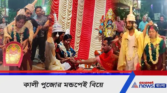 চলছিল কালী পুজো আর তার মাঝেই হল বিয়ে। মধ্যমগ্রামের একটি পুজো মন্ডপে ঠিক এমন ঘটনাই ঘটেছে। কালী পুজো শেষে ওই পুজো মন্ডপে তখন ভাসানের প্রস্তুতি চলছিল। ঠিক সেই সময়েই একটি ছেলে ও মেয়ে সেখানে গিয়ে একে অপরকে বিয়ে করার আর্জি জানায়। সেখানকার মানুষজনও তাদের এই আর্জি মেনে নিয়ে বিয়ের প্রস্তুতি শুরু করে সেখানেই। মেয়েটির শাড়ি ও ছেলের ধুতি পাঞ্জাবির ব্যবস্থাও নাকি পাড়ার লোকেরাই করে। এর পরে নিয়ম মেনে চার হাত এক হয় সেখানে। ছেলেটি অবশ্য ওই পাড়াতেই থাকে বলে জানা গিয়েছে। তাদের বিয়ে শেষ হওয়ার পরেই মা কালীর ভাসান হয়।