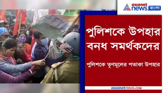 পুলিশকে তৃণমূলের পতাকা আর চকলেট দিল বন্ধ সমর্থকরা। পশ্চিম বর্ধমান জেলার দুর্গাপুরে দেখা গেল এই ছবি। এ দিন দুর্গাপুর এলাকায় রাস্তা অবরোধ করে বন্ধ সমর্থনকারীরা। রাস্তায় টায়ার জ্বালিয়ে বিক্ষোভ দেখায়। বন্ধ তুলতে পাকিস এলে তাকে উপহার সরূপ তৃণমূলের ঝান্ডা দেওয়া হয়। পুলিশ নিতে না চাইলে এক প্রকার জোর করেই দেওয়া হয়। বন্ধ সমর্থনকারী দের কথায় পুলিশ তৃণমূলের দলদাস। তাই বন্ধ সমর্থকদের এই গান্ধীগিরি।