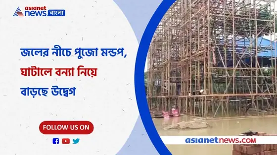 নির্মীয়মান পুজোমণ্ডপ এখন বুক সমান জলে, টানা বৃষ্টিতে ভাসছে ঘাটাল