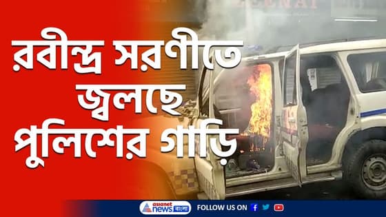 রবীন্দ্র সরণীতে জ্বলছে পুলিশের গাড়ি। পুলিশ-বিজেপি সংঘর্ষে রণক্ষেত্র এলাকা। আগুনের কবলে পুলিশের গাড়ি। পুলিশের পিসিআর ভ্যানে আগুন। সম্পূর্ণ ভস্মীভূত পুলিশের গাড়িটি। আতঙ্ক গোটা এলাকায়। জল দিয়ে আগু নেভান দমকলকর্মীরা। রণক্ষেত্রের চেহারা নিয়েছে গোটা এলাকা।