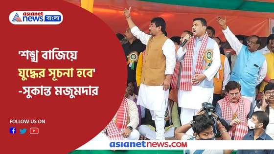 তিন দিন ব্যাপী ছিল কিষাণ মোর্চার ধর্না কর্মসূচি। বৃহস্পতিবার ছিল ধর্না কর্মসূচির শেষ দিন। এদিনই নবান্ন অভিযানের ডাক দিলেন সুকান্ত মজুমদার। 'শঙ্খ বাজিয়ে যুদ্ধের সূচনা হবে', এও বলতে শোনা যায় তাঁকে।
