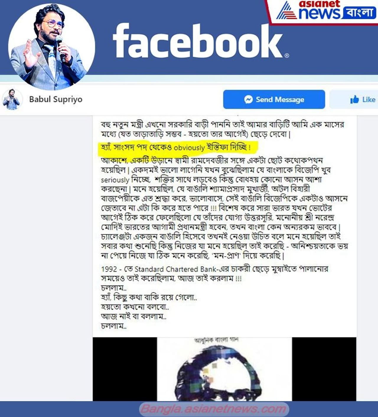 এদিকে আজ বিকেলে বাবুলের ওই পোস্ট ফেসবুকে ছড়িয়ে পড়তেই জল্পনা শুরু হয়ে যায়, তা হলে কি সাংসদ পদও ত্যাগ করতে চলেছেন তিনি? সেই জল্পনাই সত্যি করে ঠিক ঘণ্টাখানেক বাদে রাজনীতি থেকে বিদায় জানানোর পোস্টেই একটি বাক্য জুড়ে সব প্রশ্নের উত্তর দিয়ে দেন তিনি। লেখেন, "হ্যাঁ, সাংসদ পদ থেকেও অবশ্যই ইস্তফা দিচ্ছি।"