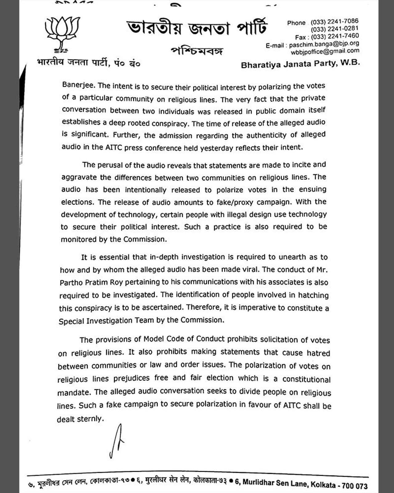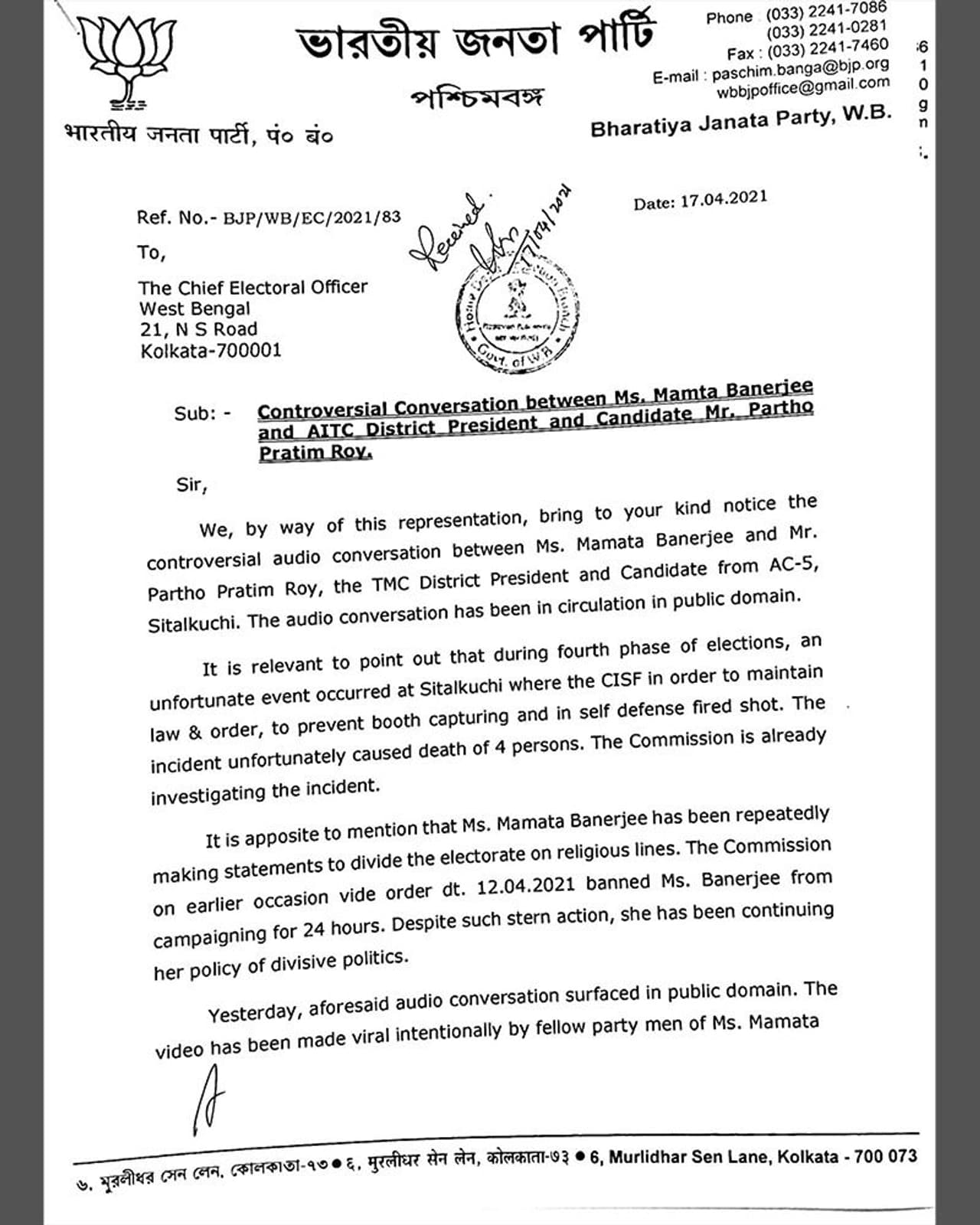 শীতলকুচিকাণ্ডে বিতর্কিত অডিও ক্লিপিং ইস্যুতে কমিশনের দ্বারস্থ হল এবার বিজেপি। বিজেপির তরফে কমিশনে লম্বা চিঠিতে শীতলকুচি-অডিও ক্লিপিং নিয়ে তৃণমূল এবং মমতার বিরুদ্ধে নিশানা করে অভিযোগ জানানো হয়েছে।