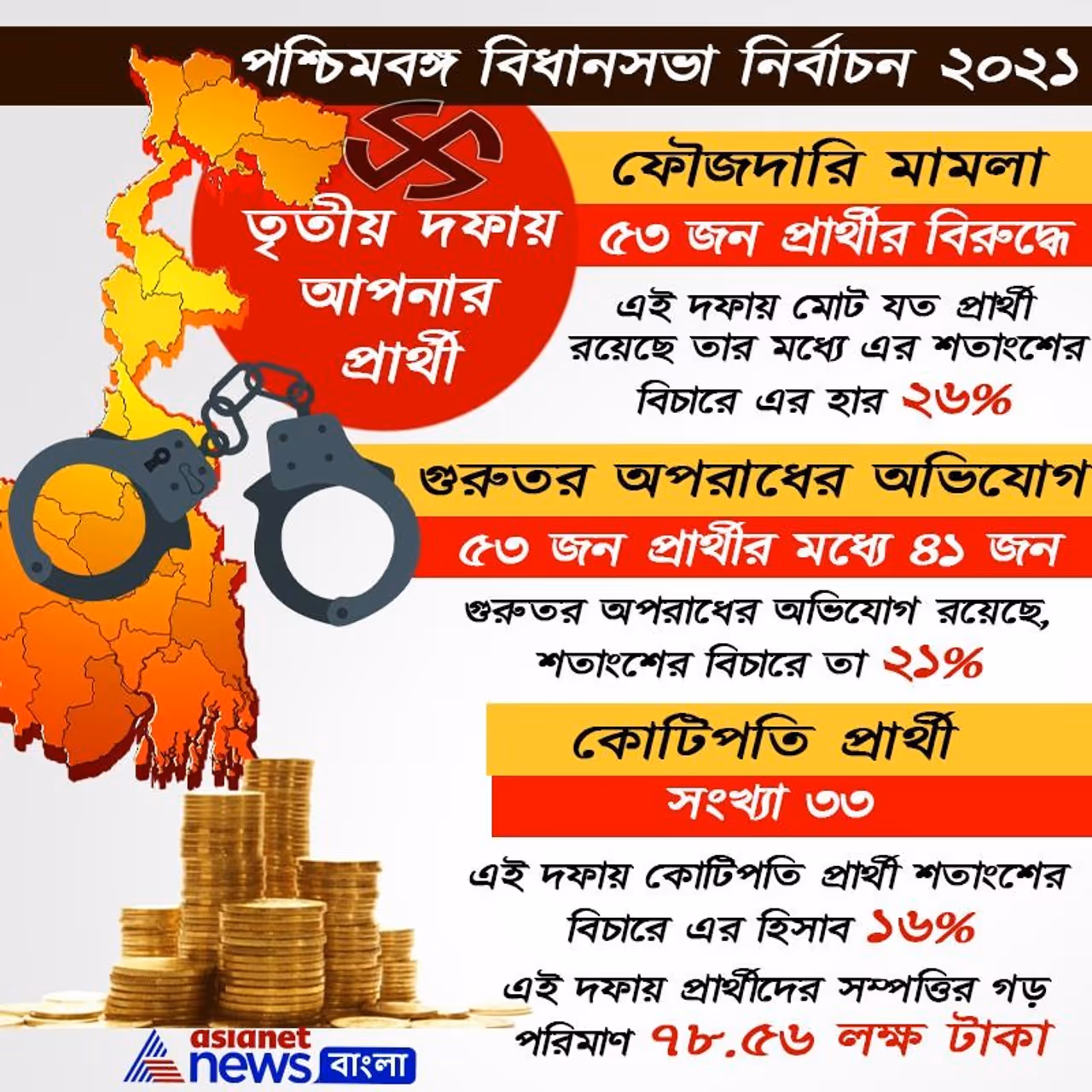 অ্যাসোসিয়েশন ফর ডেমোক্র্যাটিক রিফর্মস বা এডিআর (ADR) জানিয়েছে, তৃতীয় দফায় প্রতিদ্বন্দ্বিতা করা প্রার্থীদের ২৬ শতাংশই, নির্বাচন কমিশনের কাছে জমা দেওয়া হলফনামায় তাঁদের বিরুদ্ধে ফৌজদারি মামলা থাকার কথা ঘোষণা করেছেন। নির্বাচনের এই দফার মোট ২০৫ জন প্রার্থীর মধ্য়ে ৫৩ জনের বিরুদ্ধে ফৌজদারি মামলা রয়েছে। এদের মধ্যে ৪৩ জন অর্থাৎ মোট প্রার্থীর ২১ শতাংশের বিরুদ্ধেই গুরুতর ফৌজদারি অর্থাৎ জামিন অযোগ্য মামলা রয়েছে। এই ৪৩ জনের মধ্যে ১৬ জন বিজেপির, ৫ জন সিপিএম-এর এবং ১০ জন তৃণমূলের। ৩১ টি বিধানসভা কেন্দ্রের মধ্যে ৮টিতেই তিন বা ততোধিক ফৌজদারি মামলা থাকা প্রার্থী লড়ছেন।
