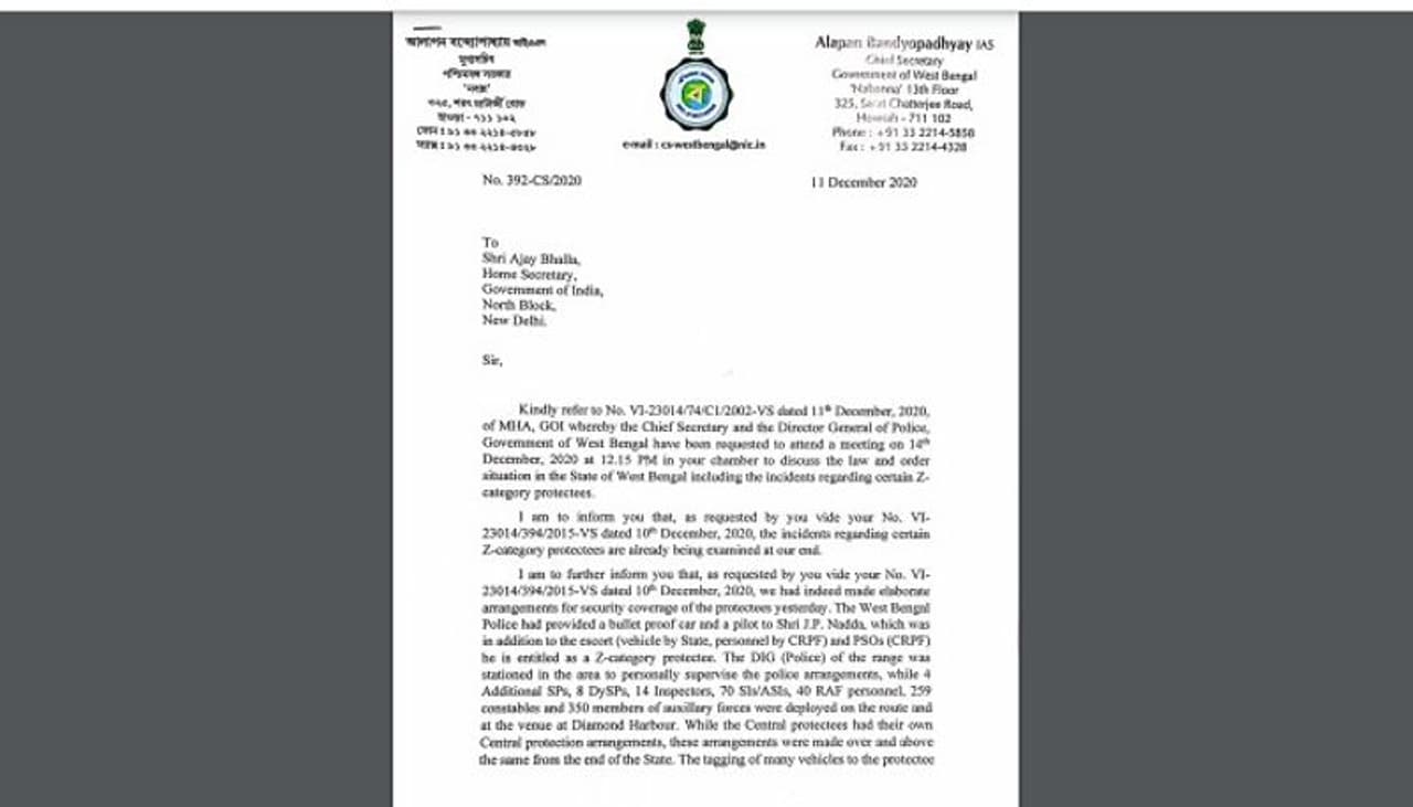 কেন্দ্রীয় সরকারকে চিঠি লিখলেন আলাপন বন্দ্যোপাধ্যায় জানিয়ে দিলেন তিনি দিল্লি যাচ্ছেন না তবে নাড্ডার কনভয়ে হামলায় গুরুত্ব দিচ্ছে রাজ্য নিরাপত্তার খতিয়ানও তুলে ধরেন তিনি