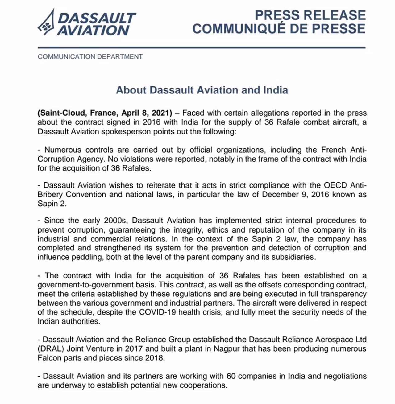 ডাসল্ট এভিয়েশন সংস্থার জারি করা বিবৃতি