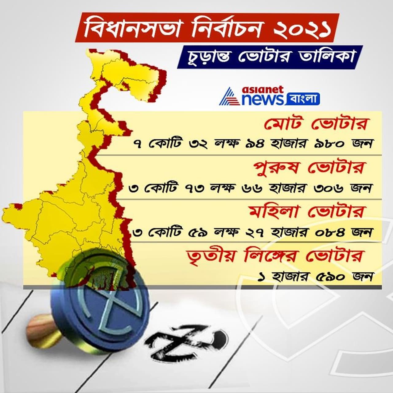 রাজ্যের ২৯৪টি আসনের ভিত্তিতে যে চূড়ান্ত ভোটার তালিকা প্রকাশ করা হয়েছে। তাতে এবার রাজ্যে ভোটযজ্ঞে অংশ নিতে চলেছে মোট ৭ কোটি ৩২ লক্ষ ৯৪ হাজার ৯৮০ জন। এই মোট ভোটারেরর মধ্যে পুরুষ ভোটারের মহিলাদের থেকে কিছুটা বেশি। রাজ্যের পুরুষ ভোটারের সংখ্যা হল ৩ কোটি ৭৩ লক্ষ ৬৬ হাজার ৩০৬ জন, আর মহিলা ভোটারের সংখ্যা হল ৩ কোটি ৫৯ লক্ষ ২৭ হাজার ০৮৪ জন। তৃতীয় লিঙ্গের ভোটার ১ হাজার ৫৯০ জন। এবছর নির্বাচনে নতুন ভোটার তালিকায় নাম উঠেছে ২০ লক্ষ ৪৫ হাজার ৫৯৩ জন, নাম বাতিল করা হয়েছে ৫ লক্ষ ৯৯ হাজার ২১৯ জন, মোট সংশোধন হয়েছে ১৪ লক্ষ ৪৫ হাজার ৬৭২ জন। মোটের উপর ২ শংতাশ বৃদ্ধি। চূড়ান্ত ভোটার তালিকা প্রকাশের সঙ্গে সঙ্গে রাজ্যের ভোট পর্ব আরও একধাপ এগিয়ে গেল বলেই মনে করছে রাজনৈতিক মহল।