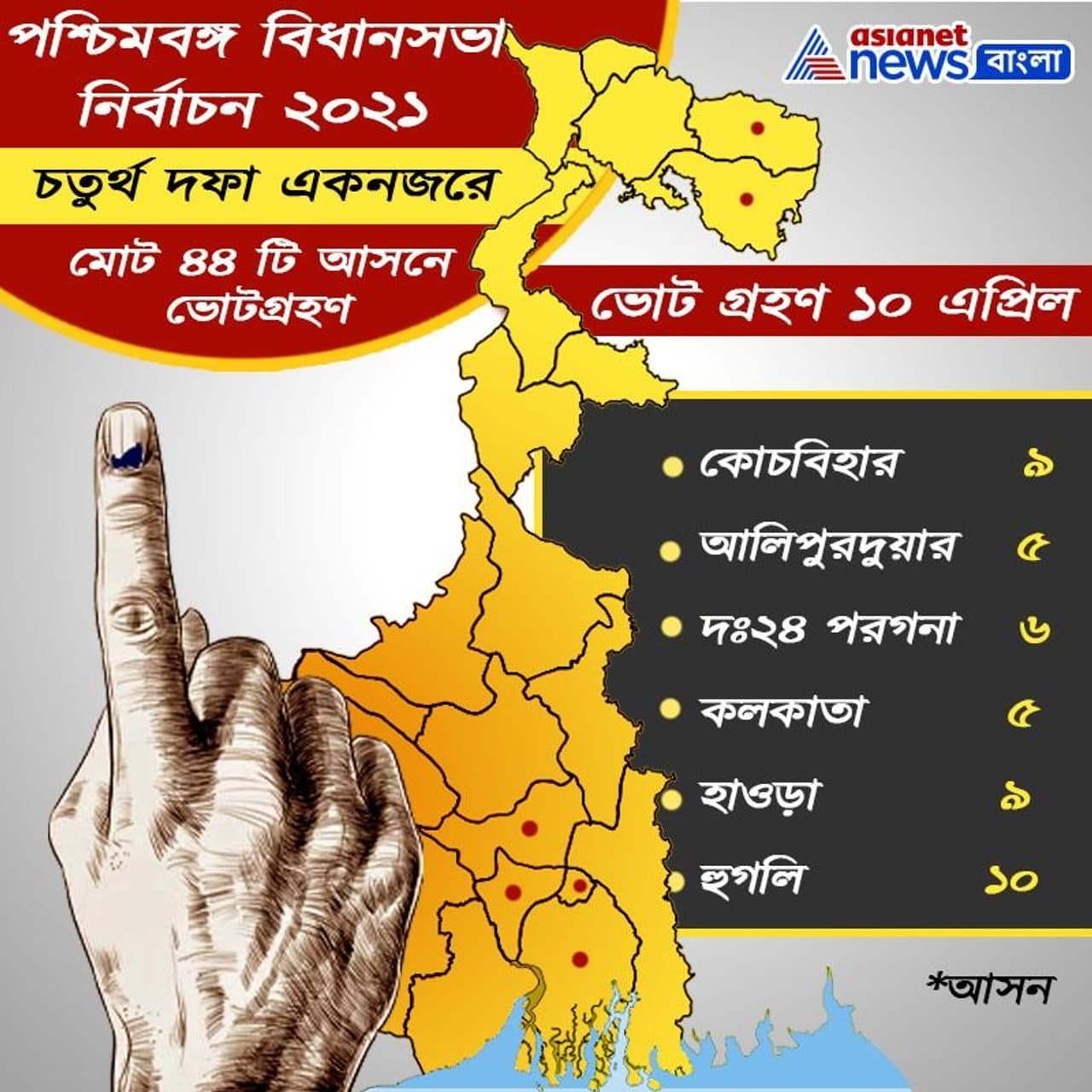 কাউন্টডাউন শুরু হয়ে গেছে। শনিবাার অর্থাৎ ১০ এপ্রিল রাজ্যে চতুর্থ দফার ভোট গ্রহণ। উত্তর বঙ্গ ও দক্ষিণ বঙ্গ মিলিয়ে রাজ্যের মোট ৪৪টি আসনে ভোট গ্রহণ হবে। নজরকাড়া আসন না থাকলেও এই ৪৪টি আসনের নির্বাচন রাজ্যের শাসকদল তথা তৃণমূল কংগ্রেসের কাছে আগ্নিপরীক্ষার সমান। কারণ ভোট পরিসংখ্যন অনুযায়ী এই ৪৪টি আসনের অধিকাংশ কেন্দ্রেই গত বিধানসভা নির্বাচনে এগিয়ে ছিল তৃণমূল কংগ্রস। তবে ২০১৯ সালের লোকসভা ভোটের নিরীখে ওই ৪৪টি আসনের মধ্যে প্রায় ২০টি আসনে এগিয়ে রয়েছে বিজেপি। ভোট প্রচারেও সেকথা স্বীকার করে নিয়ে তৃণমূল সুপ্রিমো বারবার বলেছেন বিধানসভা নির্বাচনে তাঁর দলের প্রতীকেই যেন ভোট দেন স্থানীয় বাসিন্দারা। একই সঙ্গে তিনি বলেছেন এটা দিল্লির ভোট নয়। এটা বাংলার ভোট।