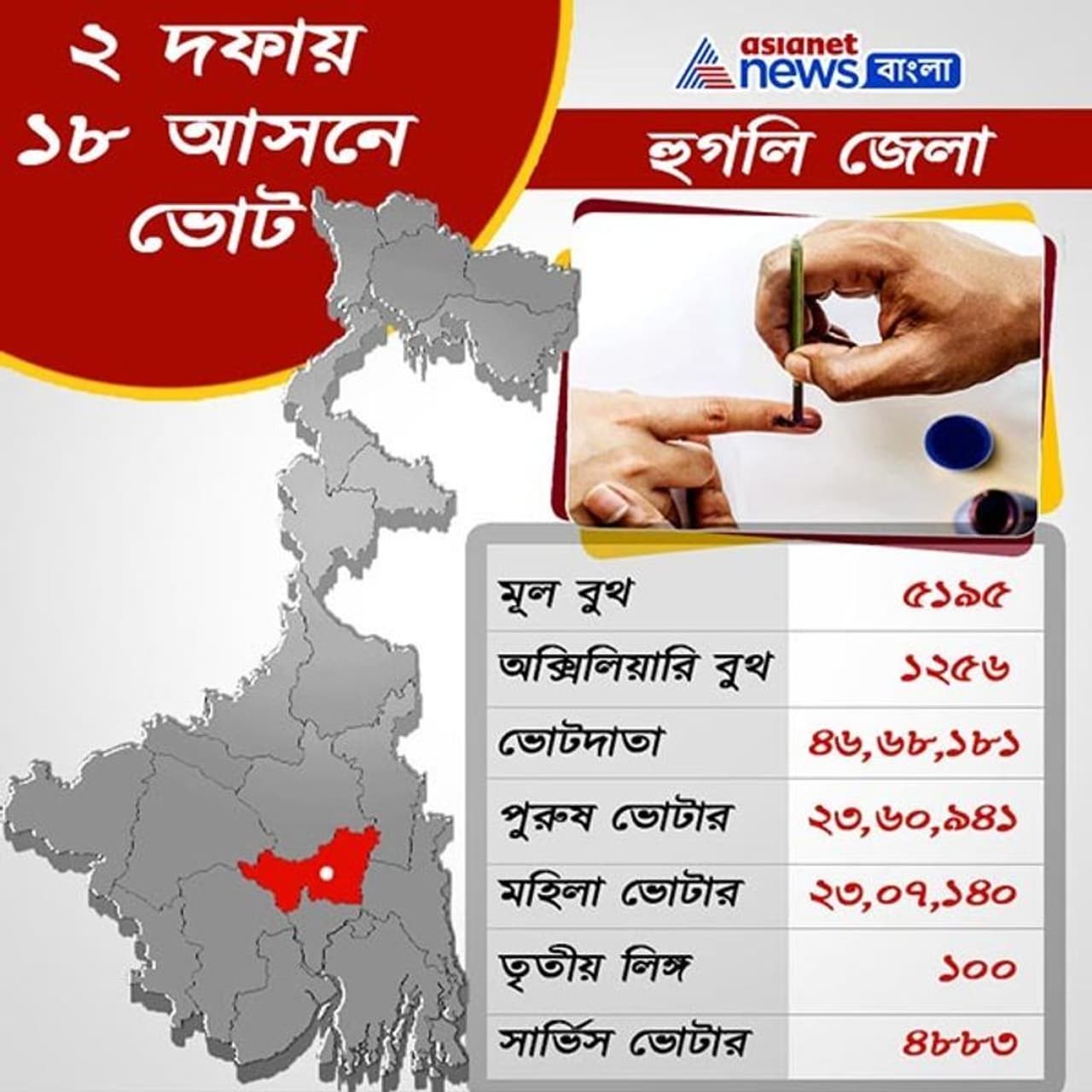হুগলি জেলায় এবার বুথের সংখ্যা ৬৪৫১টি। এরমধ্যে মেন বা মূল বুথের সংখ্যা ৫১৯৫ এবং অক্সিলিয়ারি বুথের সংখ্যা ১২৫৬। হুগলি জেলায় এবার ভোটদাতার সংখ্যা ৪৬,৬৮,১৮১। পুরুষ ভোটারের সংখ্যা ২৩,৬০,৯৪১। মহিলা ভোটারের সংখ্যা ২৩,০৭,১৪০। তৃতীয় লিঙ্গের ভোটার সংখ্যা ১০০। সার্ভিস ভোটারের মোট সংখ্যা ৪৮৮৩।